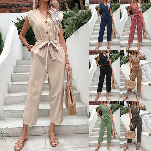 This jumpsuit combines a solid color design with a flattering V-neckline with button detailing, sleeveless silhouette, creating a chic and versatile ensemble that is perfect for various occasions, from casual outings to evening events.