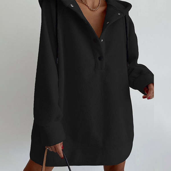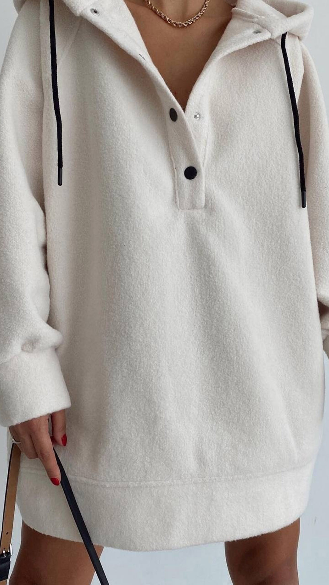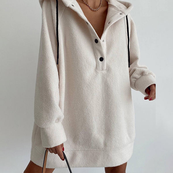 Fashion Solid Color Buttoned V-neck Long Sleeve Plush Loose Hooded Sweatshirt