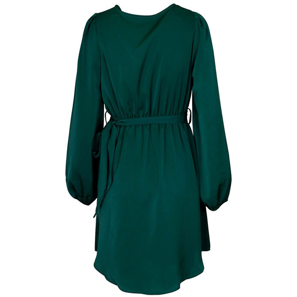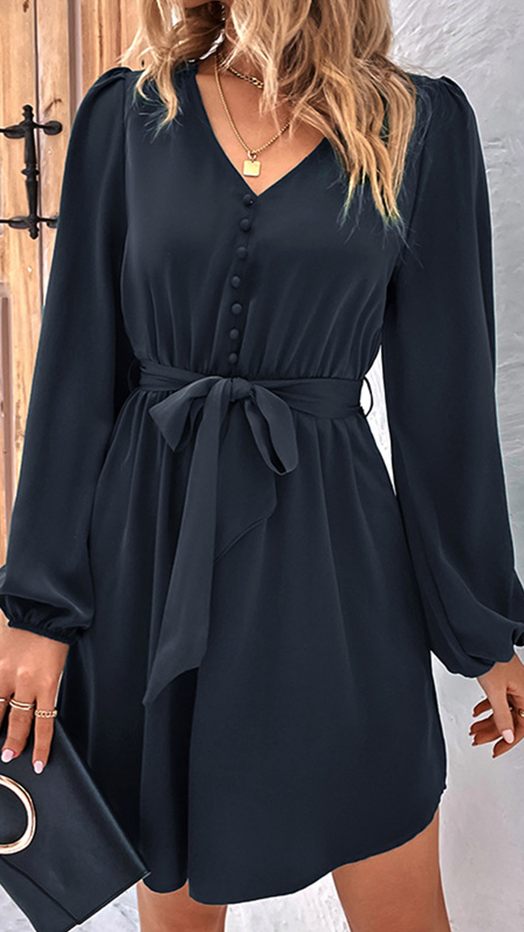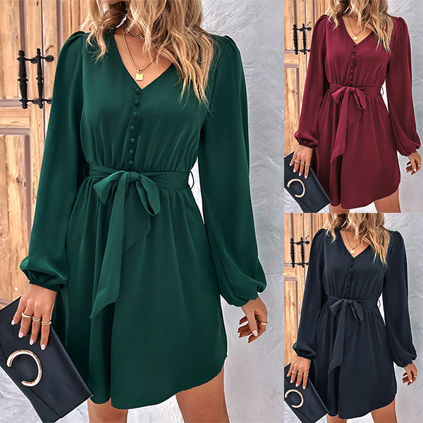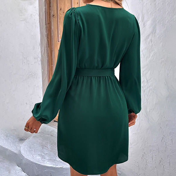 Fashion Solid Color Buttoned V-neck Long Sleeve Self-tie Mini Dress