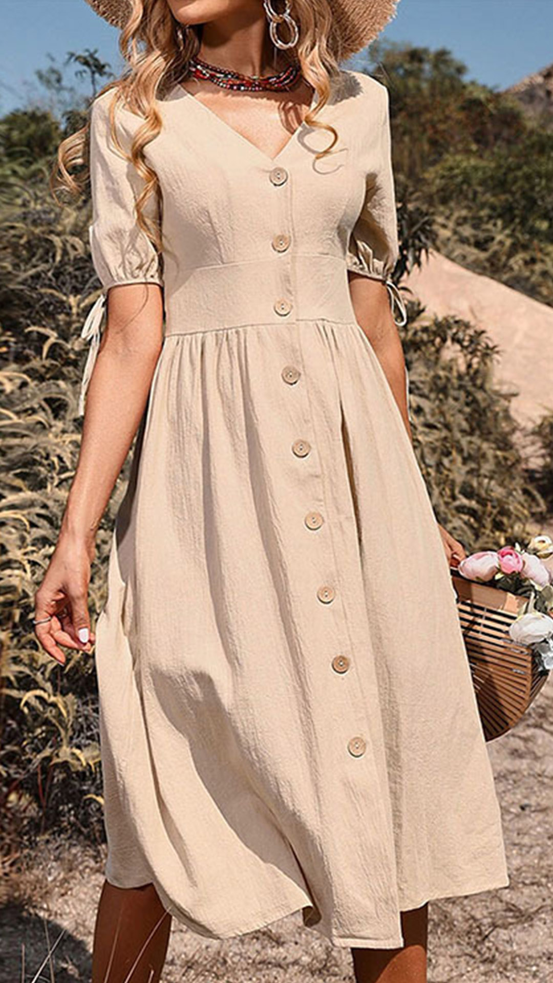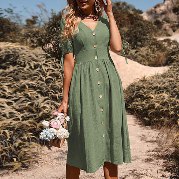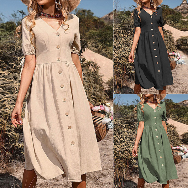 This dress typically features a solid color design, making it easy to accessorize and style. The buttoned V-neck design adds a touch of sophistication to the dress while the short sleeves make it perfect for warmer weather. The midi length of the dress falls below the knee, making it appropriate for both formal and casual events.