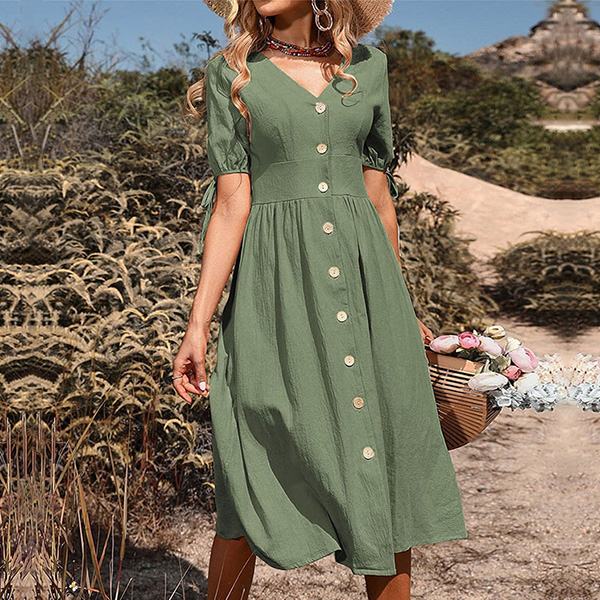 Fashion Solid Color Buttoned V-neck Short Sleeve Midi Dress