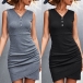 Fashion Solid Color Buttoned V-neck Sleeveless Irregular Hemline Bodycon Dress