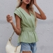 Fashion Solid Color Cap Sleeve V-neck Top with Waistband