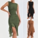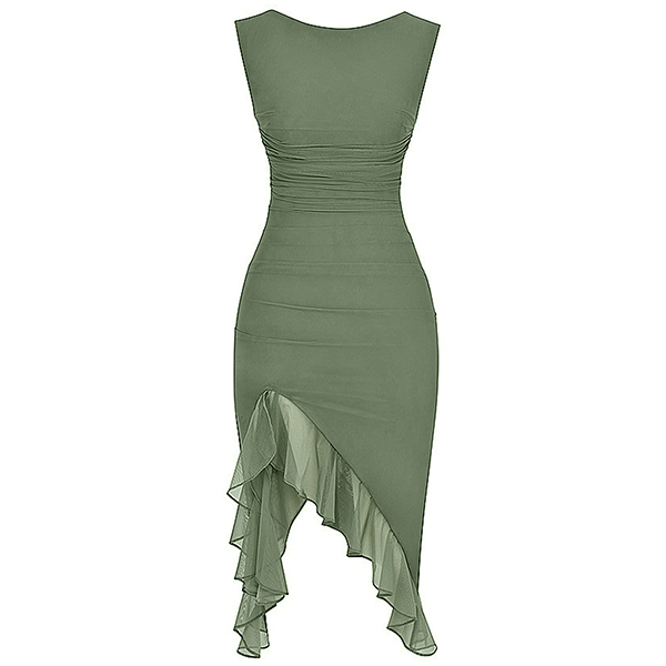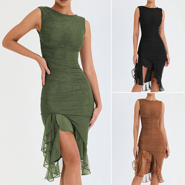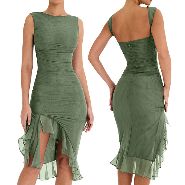 This dress is the epitome of elegance and style. The irregular chiffon spliced ruffle hemline detailing adds a touch of femininity and grace. Round neck, sleeveless backless with ruched details that adds a unique and trendy element to the dress, making it a standout piece for any occasion. Hope you like it.