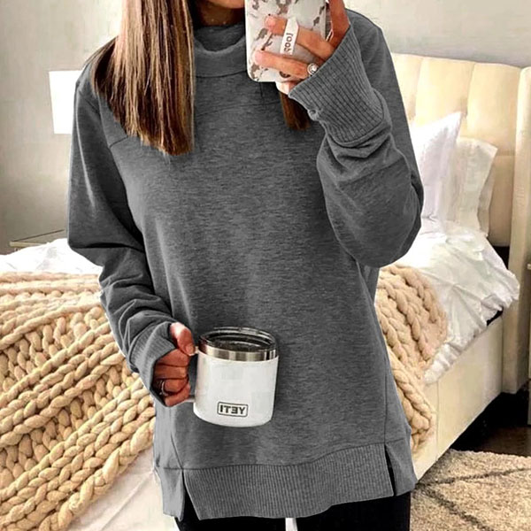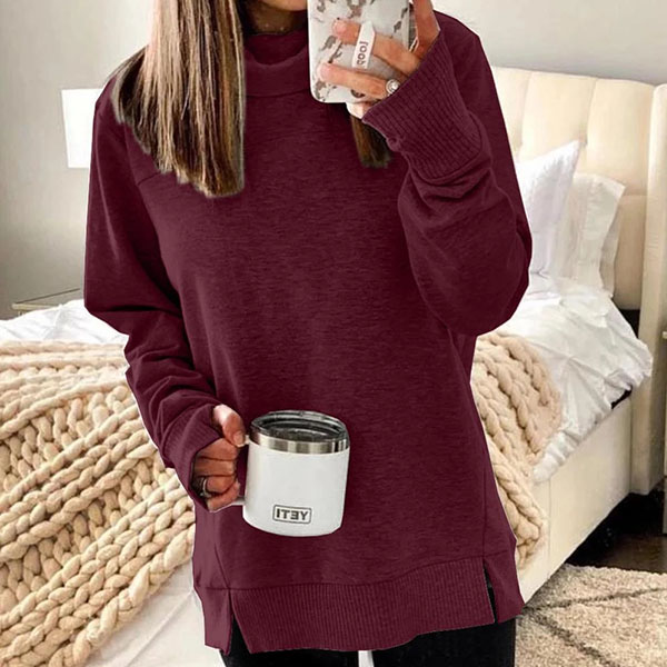 Fashion Solid Color Cowl Neck Slit Hem Loose Sweatshirt