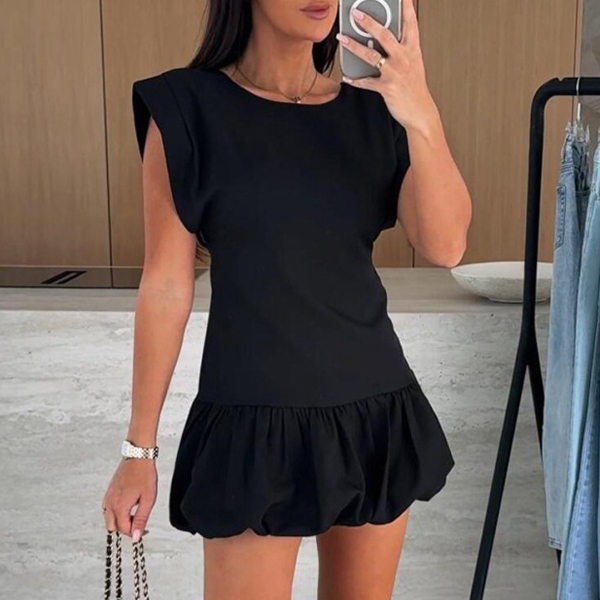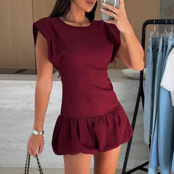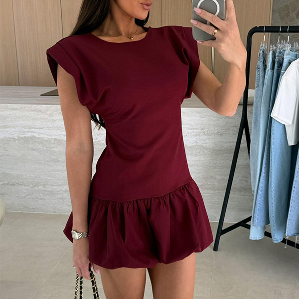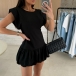Fashion Solid Color Crew Neck Cap Sleeve Ruffle Hemline Mini Dress