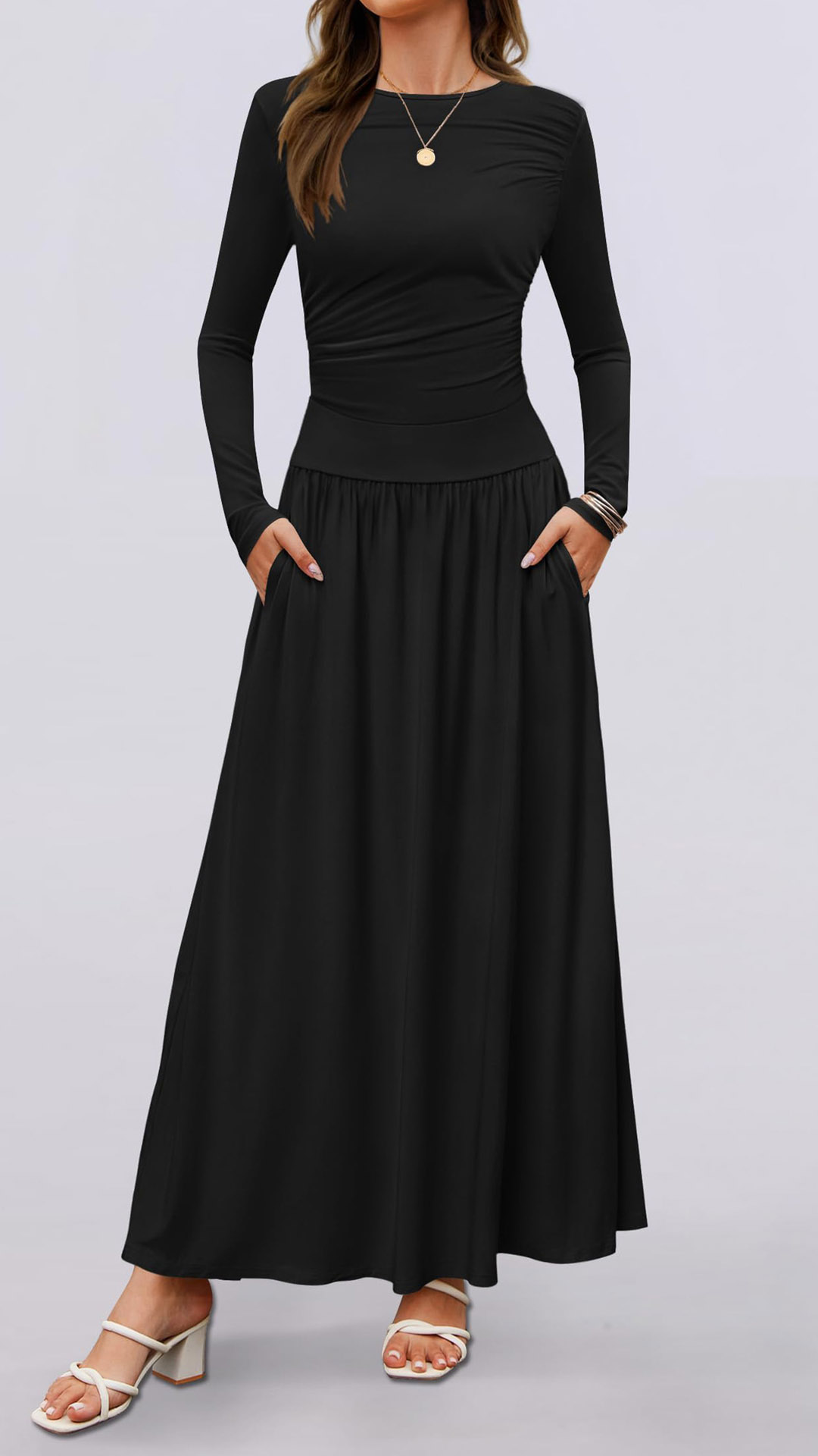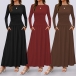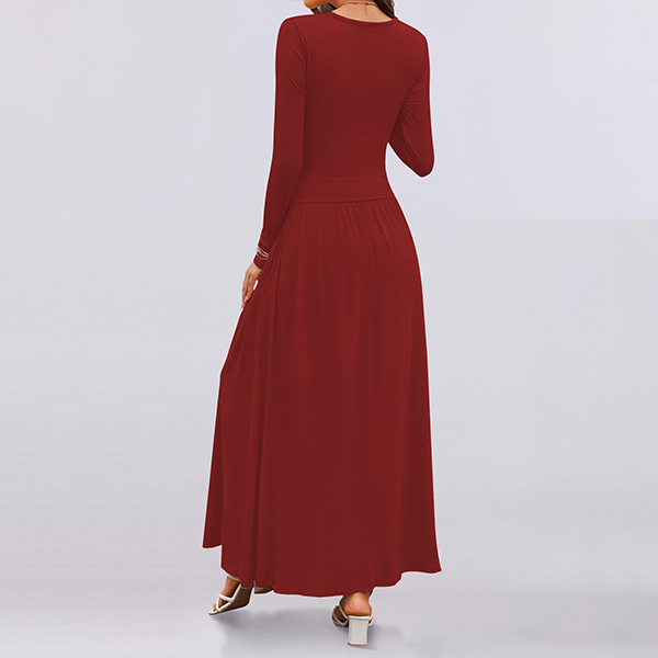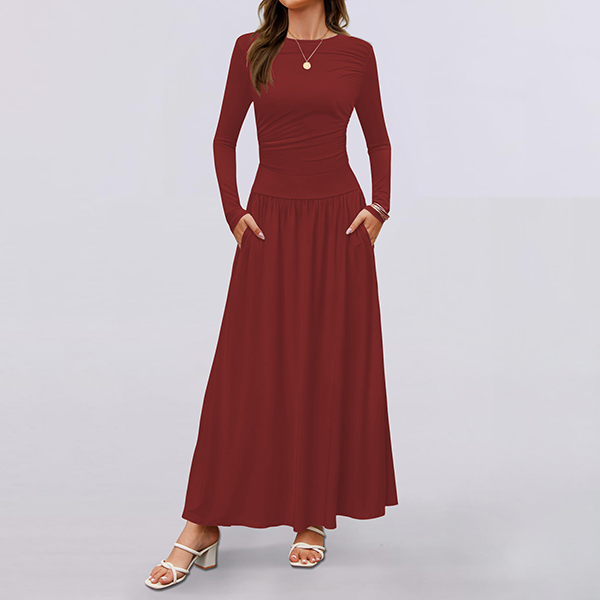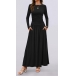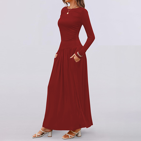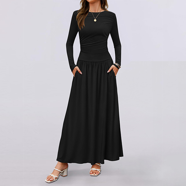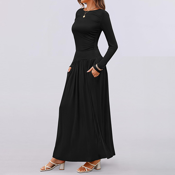 Fashion Solid Color Crew Neck Long Sleeve Side Pocket Maxi Dress