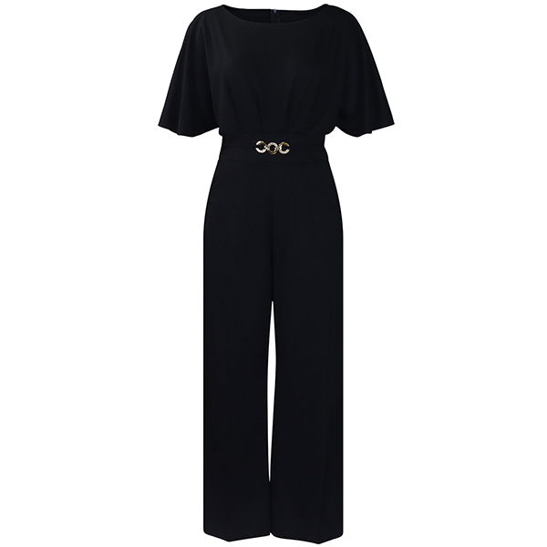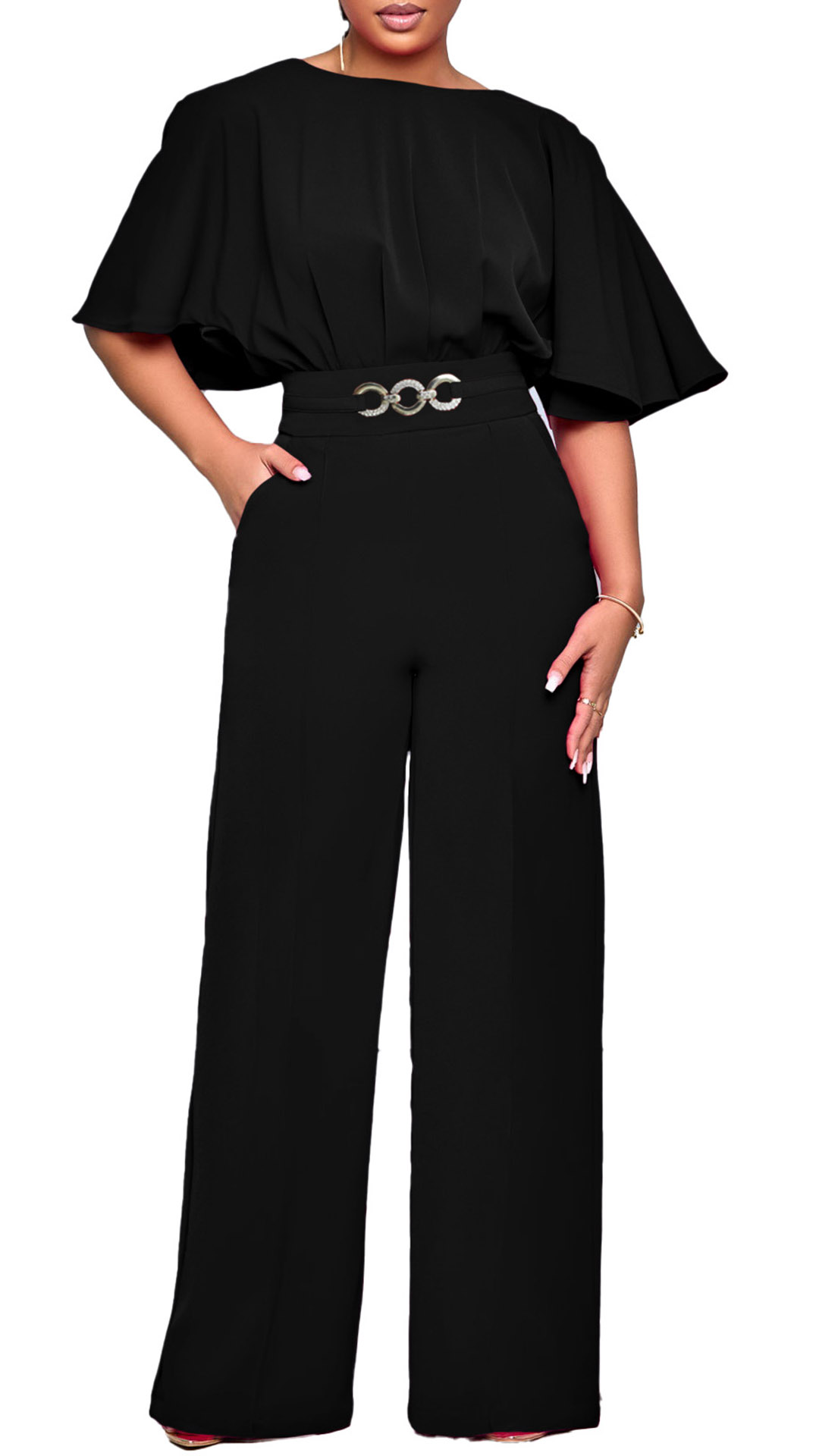 This is a trendy and chic jumpsuit that exudes modern sophistication and style. It features solid color accent, crew neck, short sleeves, wide leg and chain design along the waist. Perfect for a night out, a special event, or a stylish dinner, this jumpsuit is designed to make you feel confident and on-trend.