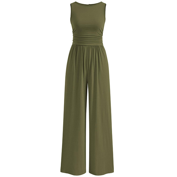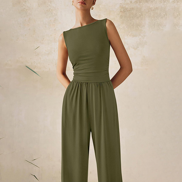 This jumpsuit features a crew neckline, sleeveless design, high-rise waist, wide-leg silhouette, and a solid color that is perfect for creating a modern and sophisticated outfit. Multi-colors available.