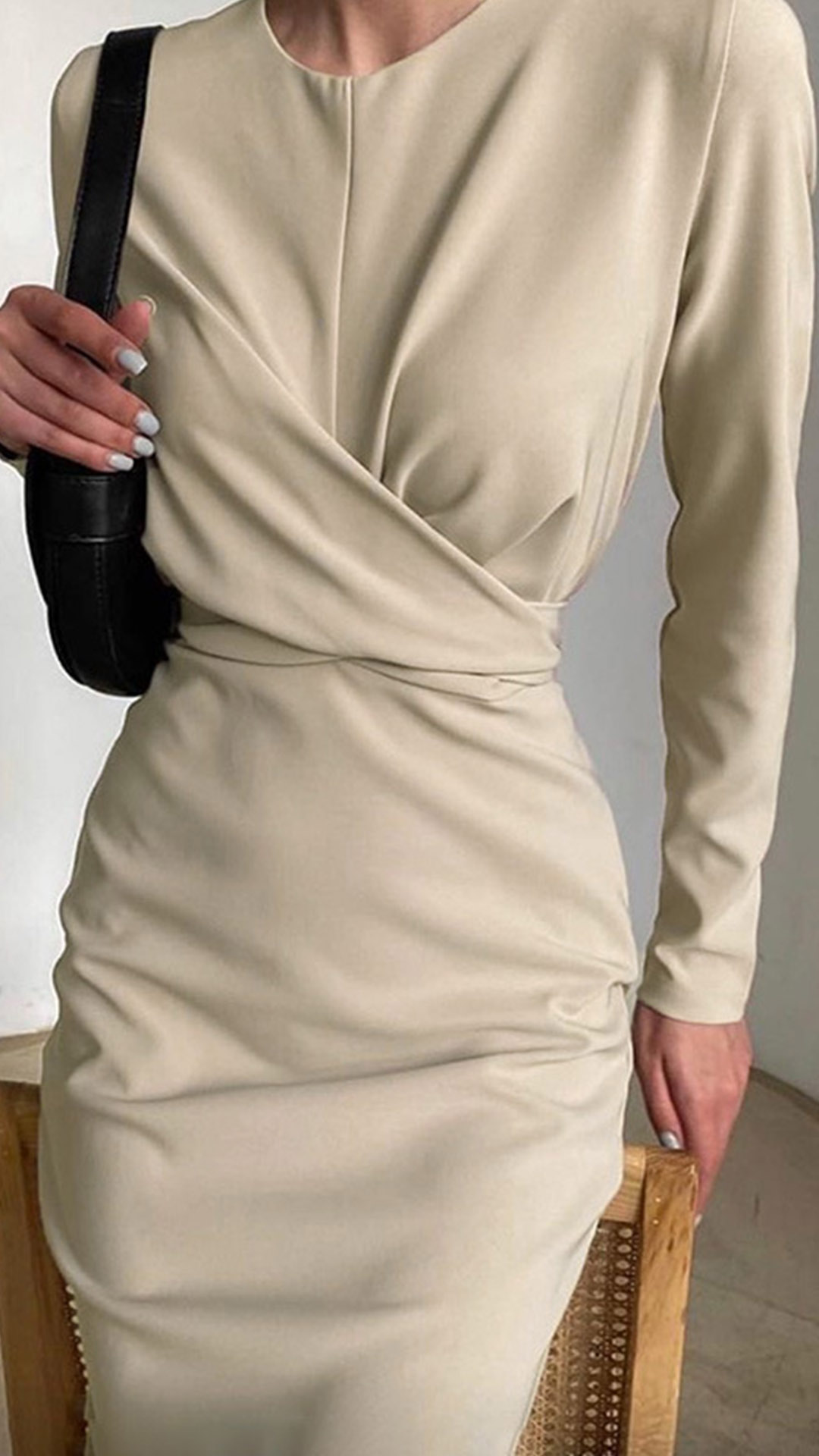 Fashion Solid Color Cross Ruched Round Neck Long Sleeve Bodycon Dress