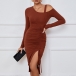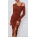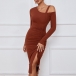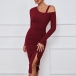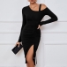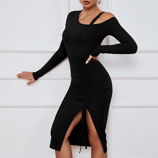 Slip into this chic and stylish bodycon ribbed dress for a trendy and contemporary look. The cut-out detailing on the shoulder adds a touch of edginess and allure, perfect for adding a modern and fashion-forward element to your outfit. While the front drawstring for ruched and slit effectgives the dress a unique and customizable touch. Pair this ribbed dress with heels or boots for a versatile and on-trend ensemble~