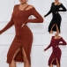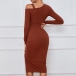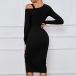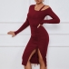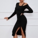 Fashion Solid Color Cut Out Long Sleeve Front Drawstring Slit Bodycon Ribbed Dress