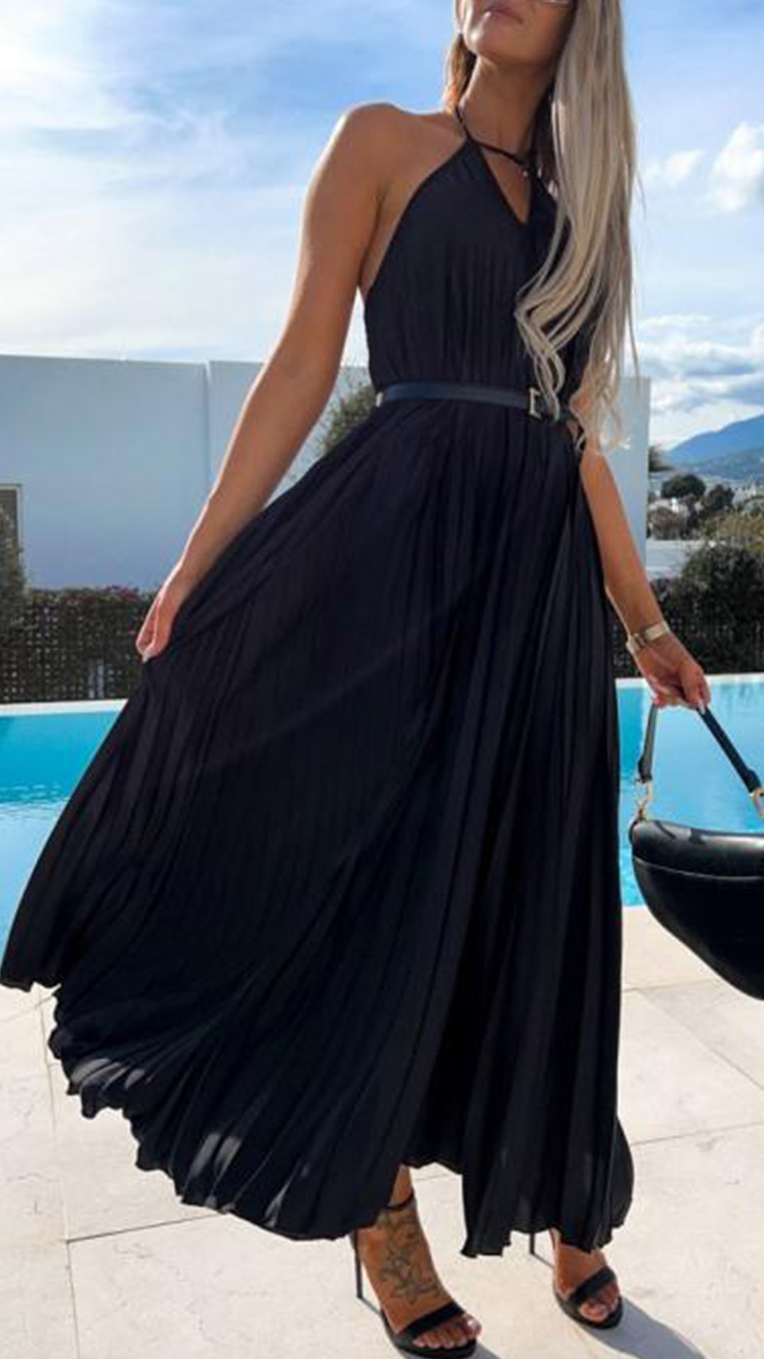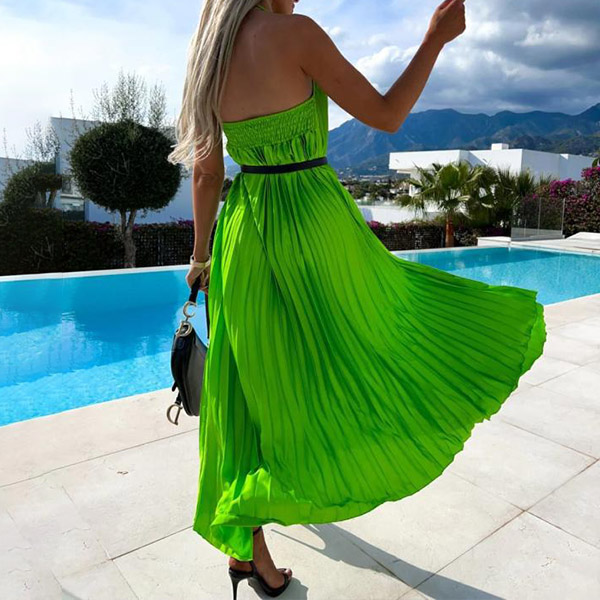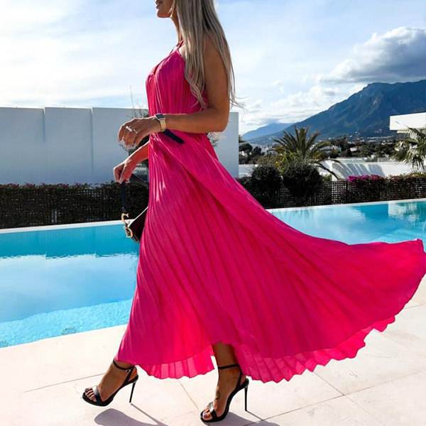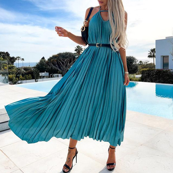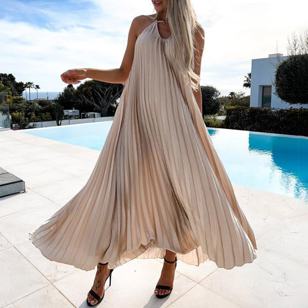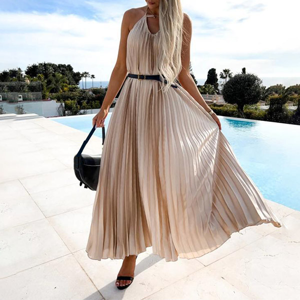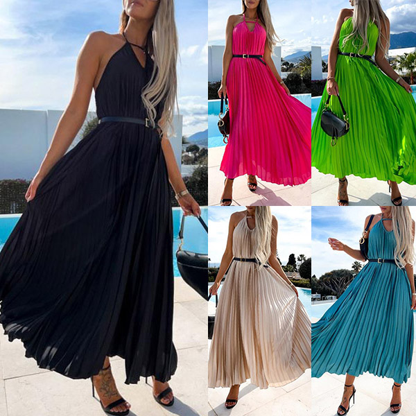 Calf-length dress in solid color, front cutout, and halter neck. The backless and pleated design adds a sexy and chic element to this dress. Made from a lightweight and comfortable material, this dress is perfect for any summer occasion.