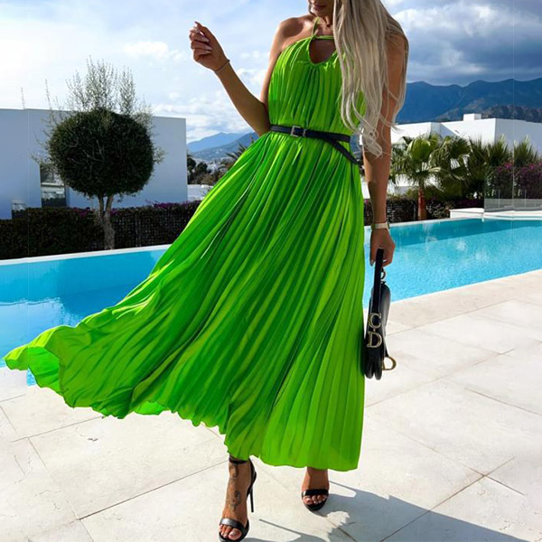 Fashion Solid Color Cutout Backless Halter Pleated Dress