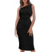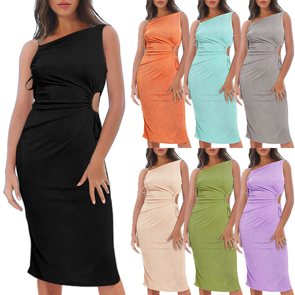 Bodycon party dress in solid color design with side cutout details and drawstring for a gathered effected. The asymmetrical shoulder design add some sexy and flirty sense, it would be a perfect party dress.
