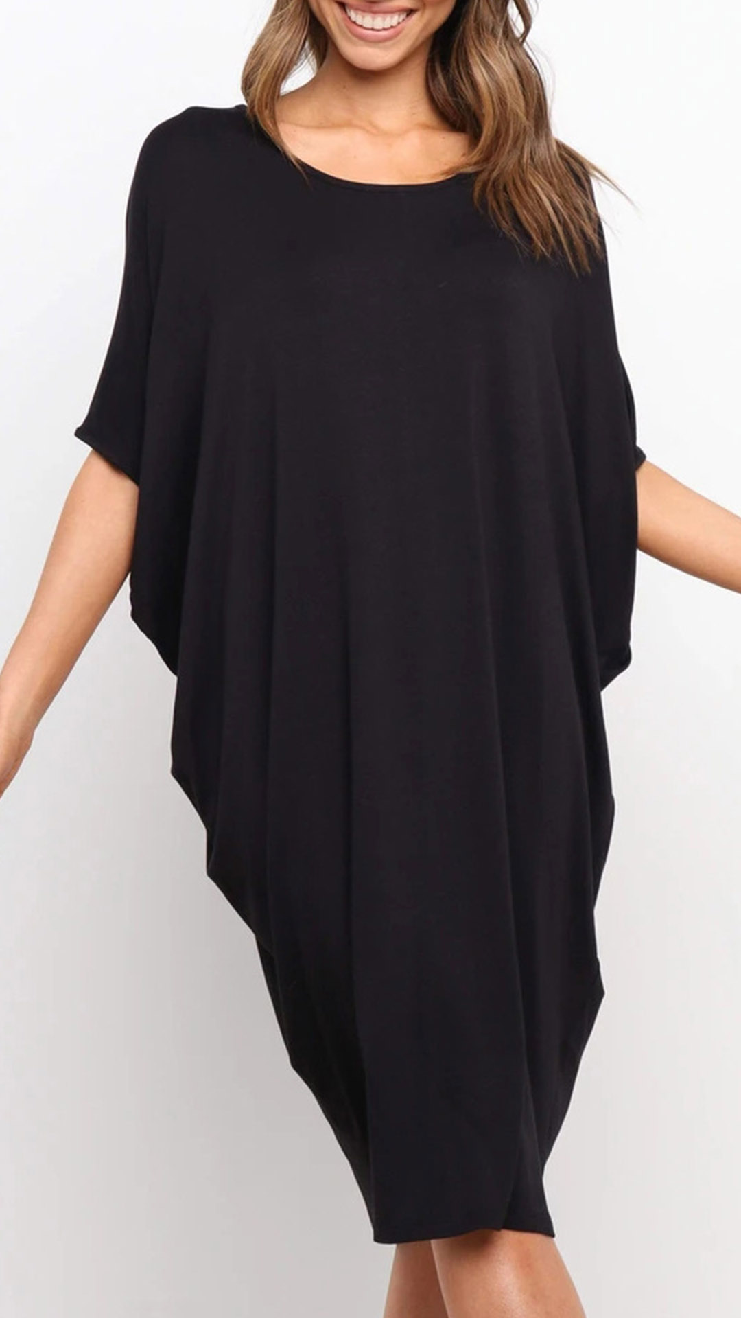 On your lazy days and rushed mornings,this dress that exudes cozy and stylish vibes is worth to arouse your attention. Comes with a flattering back tone,finished with dolman sleeve,round neck and a loose silhouette,this dress definitely knows how to give you a cozy yet stylish daily style.