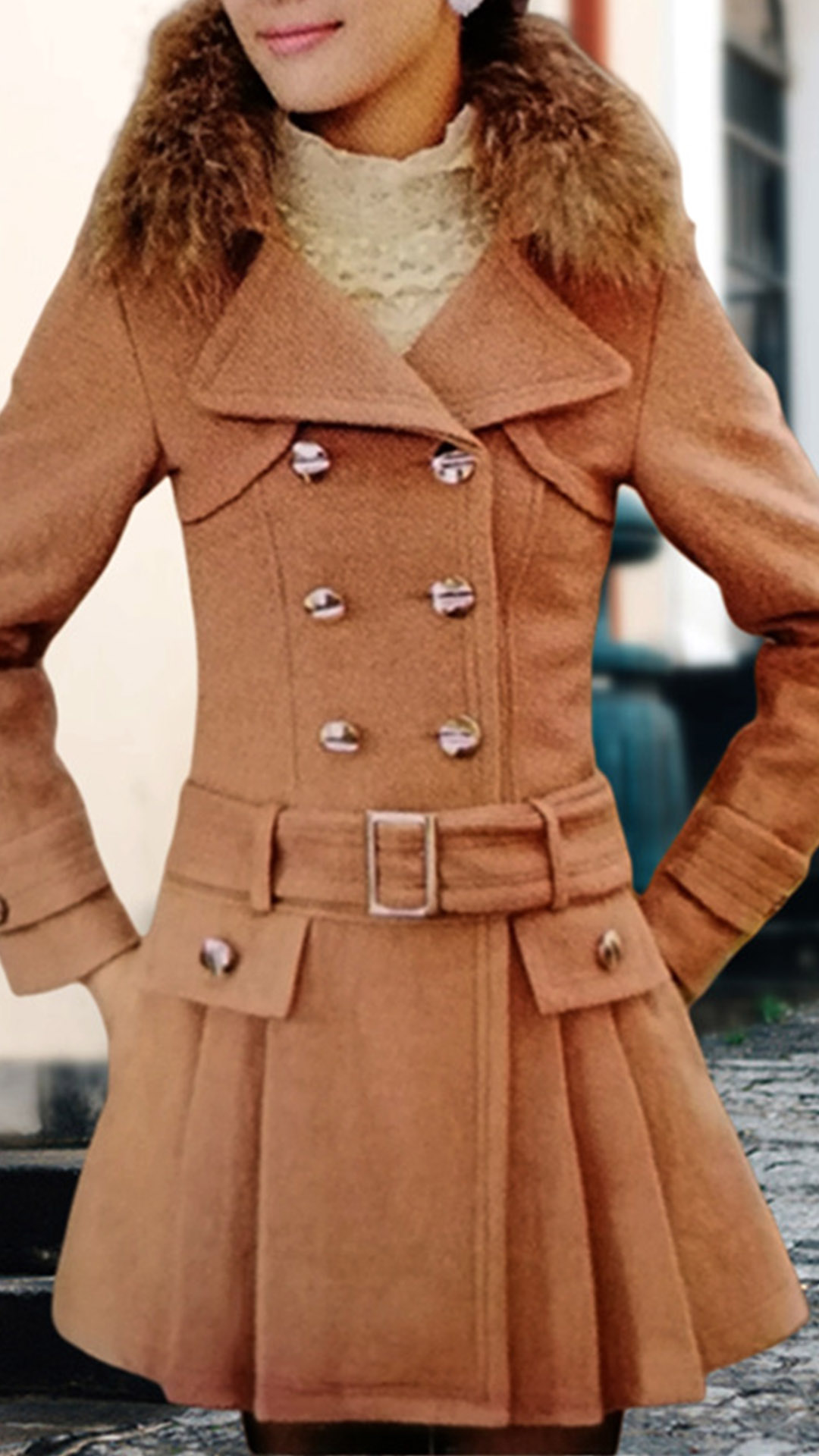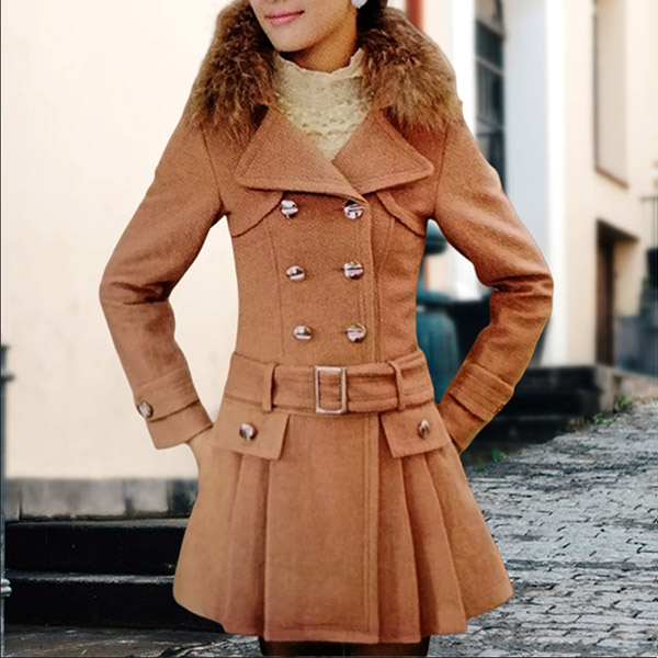 Fashion Solid Color Double-breasted Lapel Long Sleeve Ruffled Hemline Duffle Jacket for Women with Belt