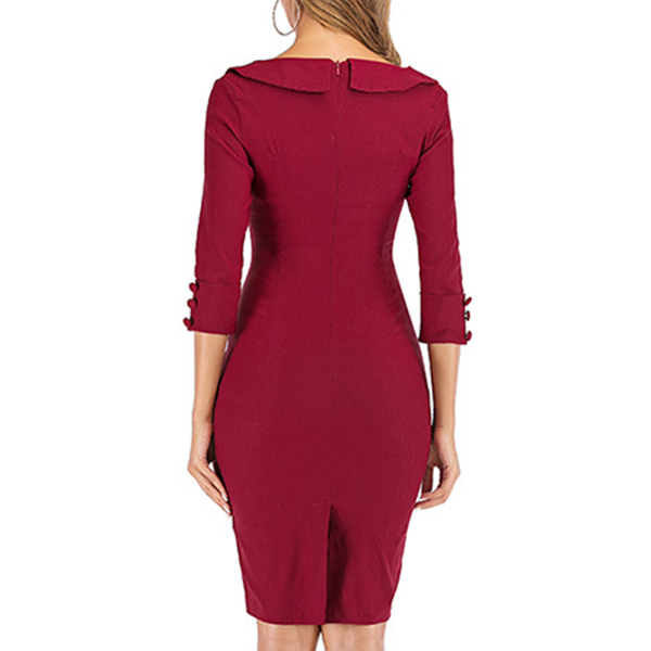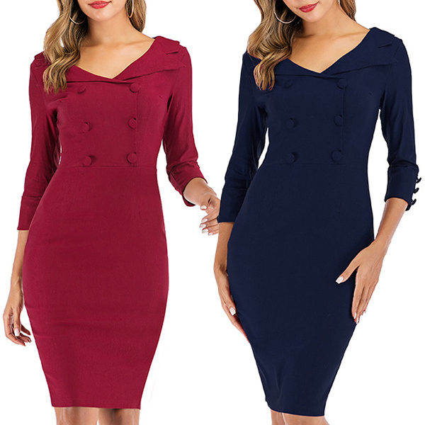 Fashion Solid Color Double-breasted V-neck Long Sleeve Bodycon Dress