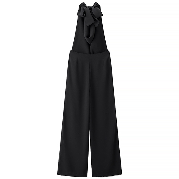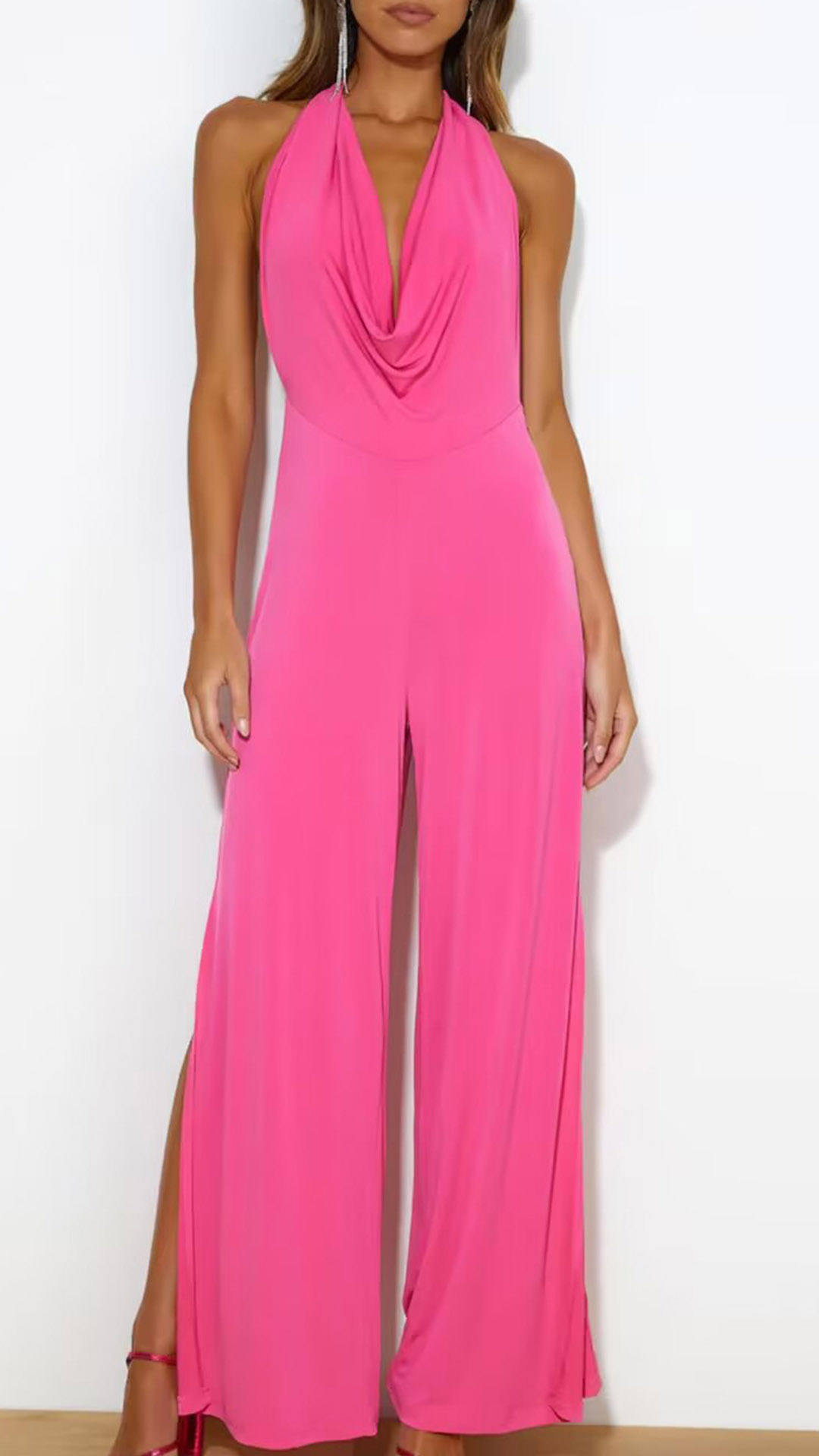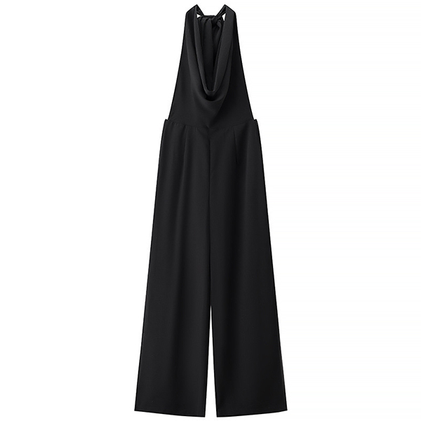 This is a chic and sophisticated jumpsuit that exudes elegance and modern flair. The solid color, draped halterneck design, backless feature, and side slits along the pants offer a chic and sophisticated appearance that is guaranteed to turn heads and leave a lasting impression. Perfect for a night out, a cocktail party, or a special event.