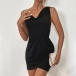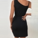 Fashion Solid Color Draped Neck Irregular Bucklet Shoulder Irregular Hemline Bodycon Dress