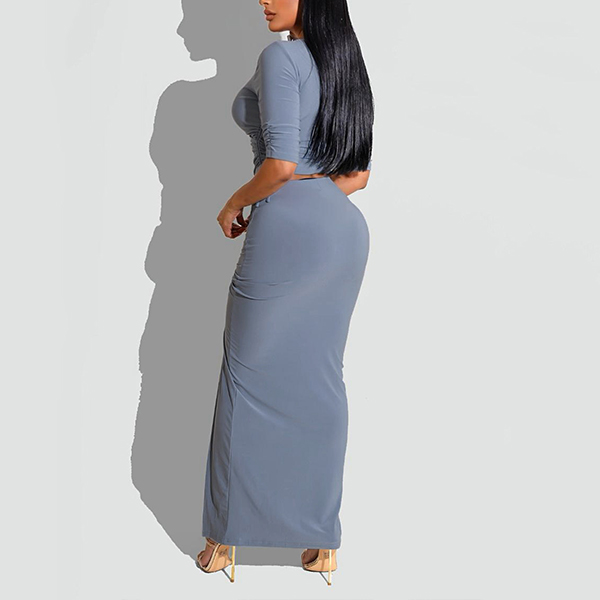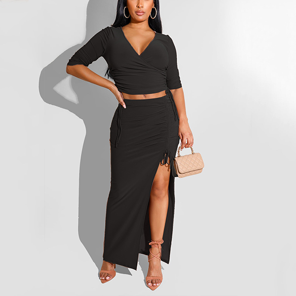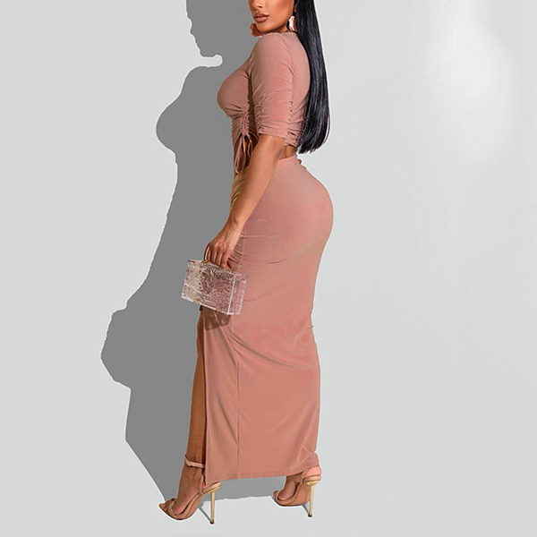 Fashion Solid Color Drawstring Two-piece Set Consist of Crop Top and Slit Skirt