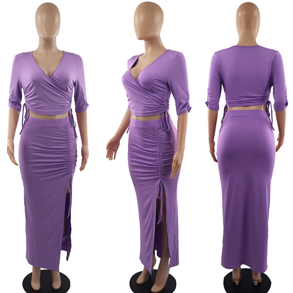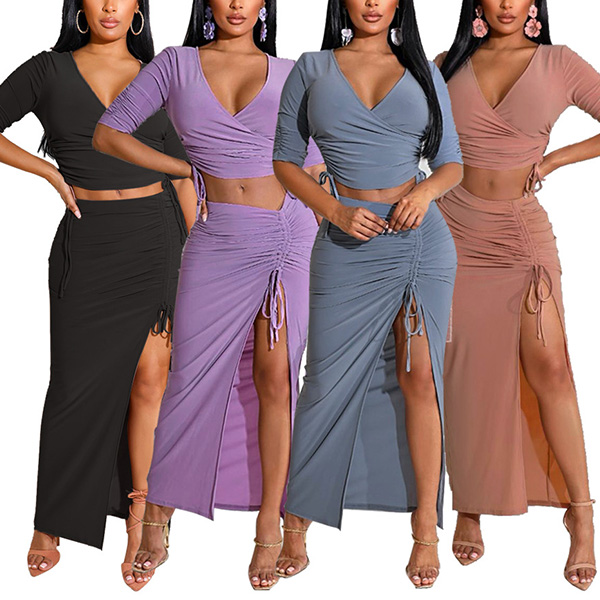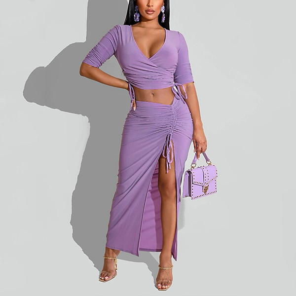 This Fashion Solid Color Drawstring Two-piece Set is the perfect way to make a statement this season. The crop top features a side drawstring for a ruched effect, giving you a flattering silhouette. The slit skirt is made with a soft, lightweight fabric that drapes beautifully, and the drawstring slit design gives you the perfect fit. The combination of the two pieces creates a look that is both stylish and comfortable.