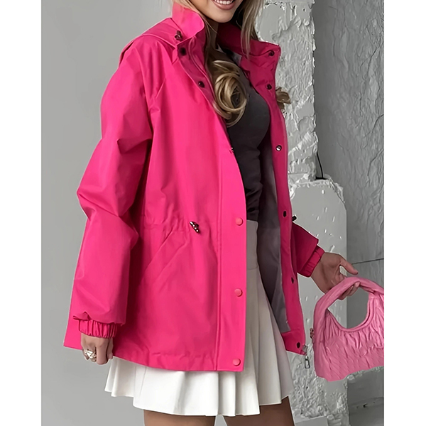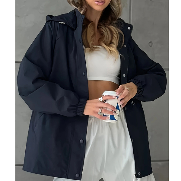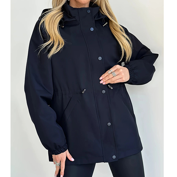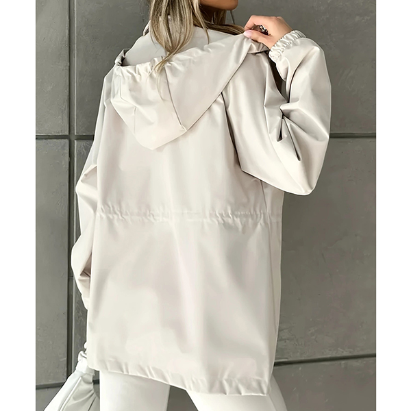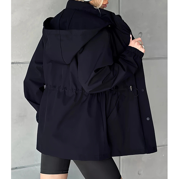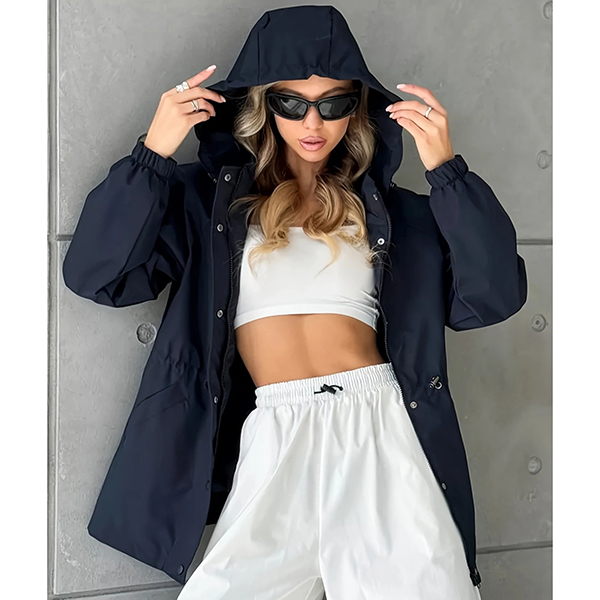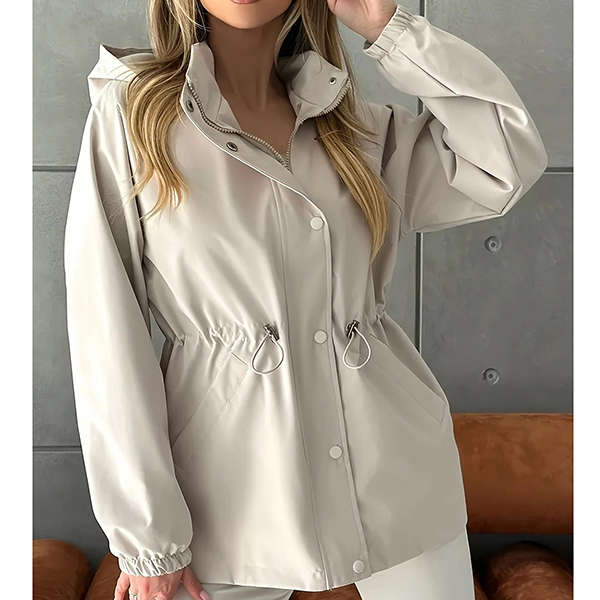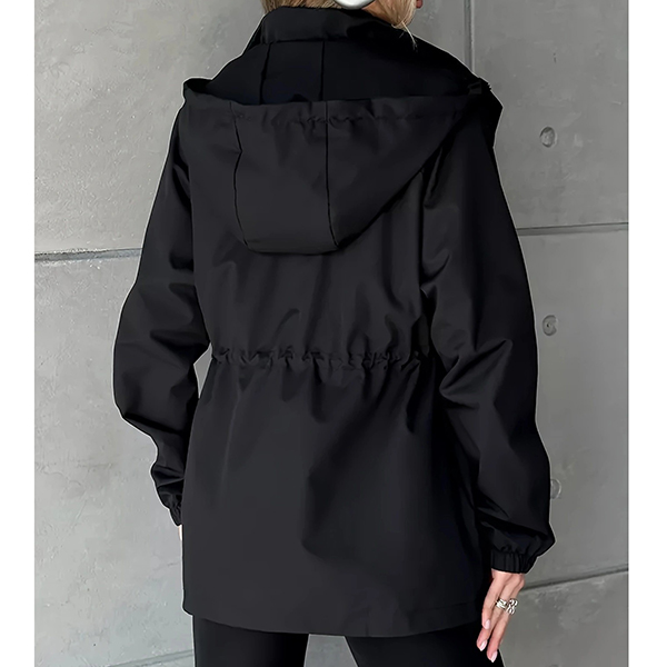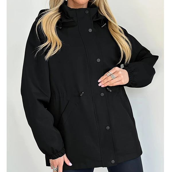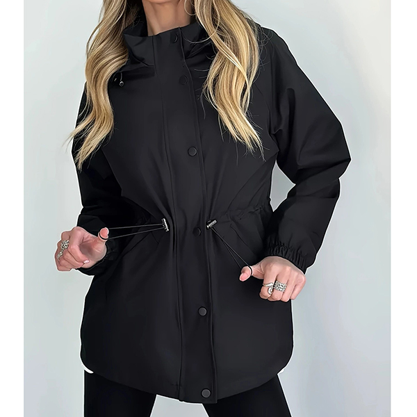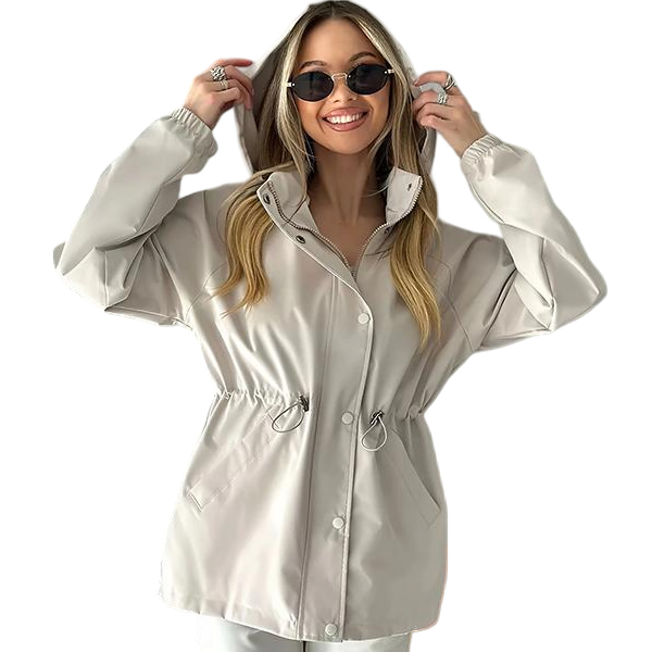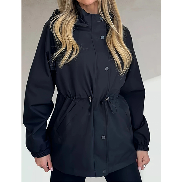 This functional jacket features waterproof construction with adjustable drawstring waist and practical hoodie styling for weather-resistant sophistication. The waterproof material provides reliable protection whilst the drawstring waist creates customizable silhouette definition and flattering proportions. Perfect for outdoor activities, rainy weather styling, or active lifestyle wear.