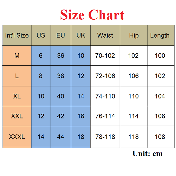 M : Waist : 70cm - 102cm(27.56" - 40.16"); Hips : 102cm(40.16"); Length : 100cm(39.37");