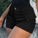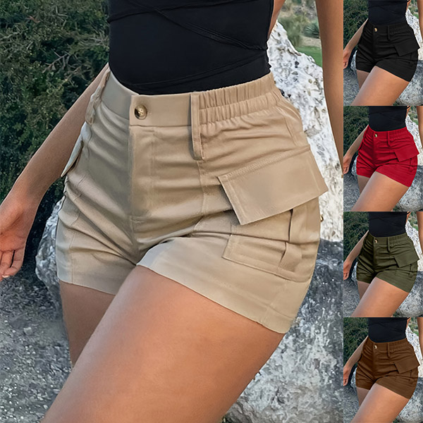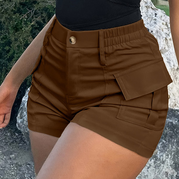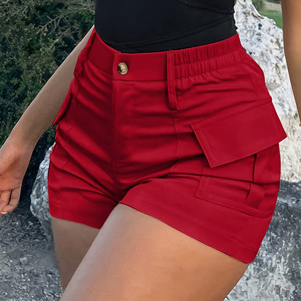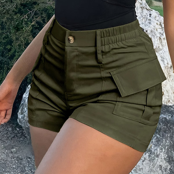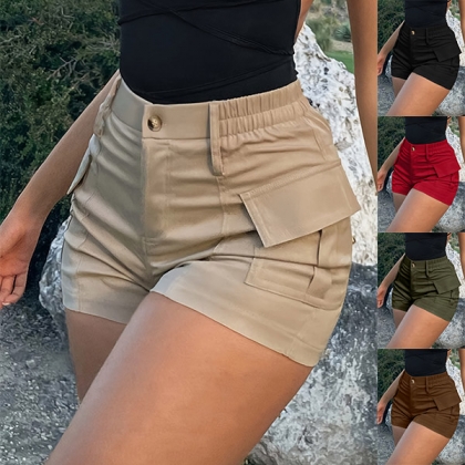 Fashion Solid Color Elastic Waist Side Patch Pockets Shorts