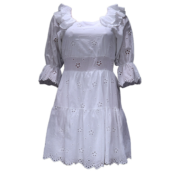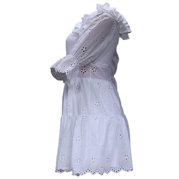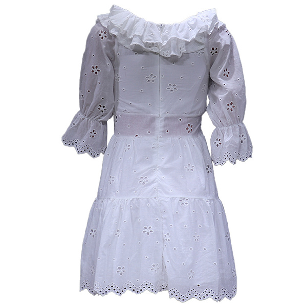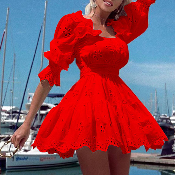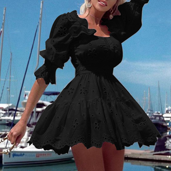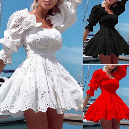 Fashion Solid Color Elbow Sleeve High-waist Ruffled Floral Hollow-out Dress