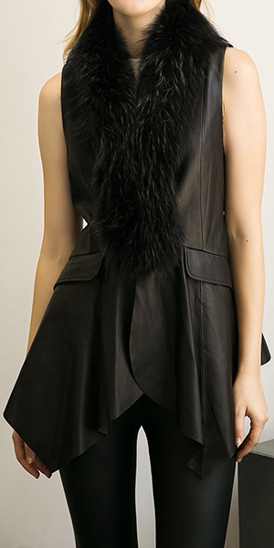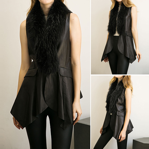 outerwear. This PU leather vest is styled with faux fur collar,irregular hem and lace-up design at waist