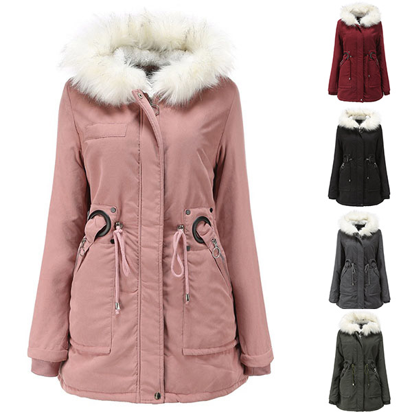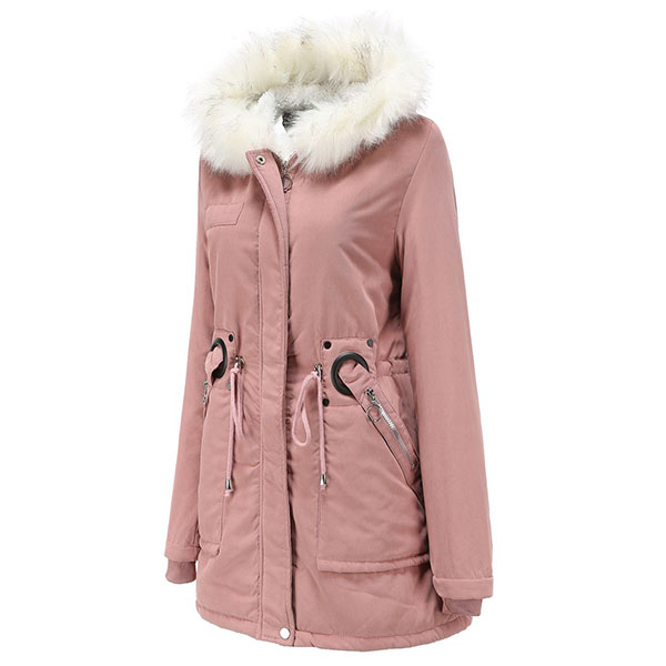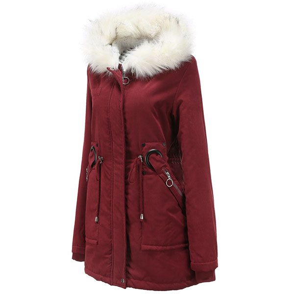 For these cold days,this padded coat can be a good choice. Solid color style,the faux fur spliced hooded silhouette and plush lining design can keep you warm and comfy all the day,while the drawstring waist design can help showcase your figure. Let it accompany your chilly days.