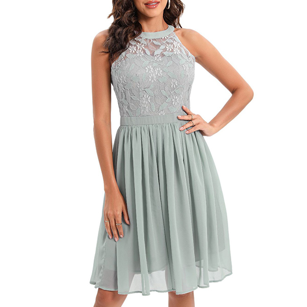 This beautiful mini dress is perfect for a summer day or a night out on the town. The solid color design is accented by intricate floral lace splicing, creating a look that is both elegant and playful. The chiffon fabric gives the dress a light and airy feel, while the fitted bodice and flowy skirt create a flattering silhouette. Wanna have a try?
