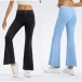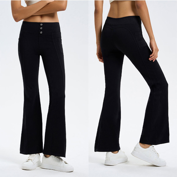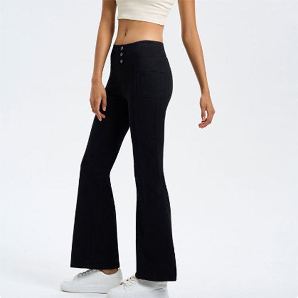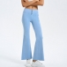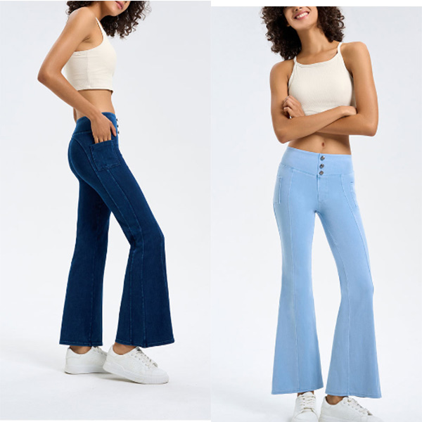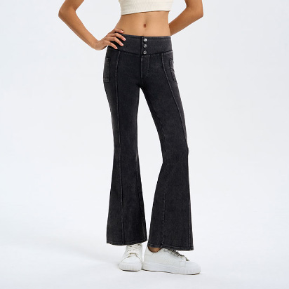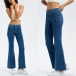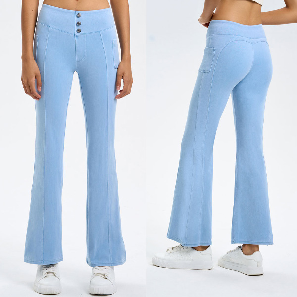 Pantalon de yoga évasé en denim, taille mi-haute avec boutons frontaux, couleur unie et moderne