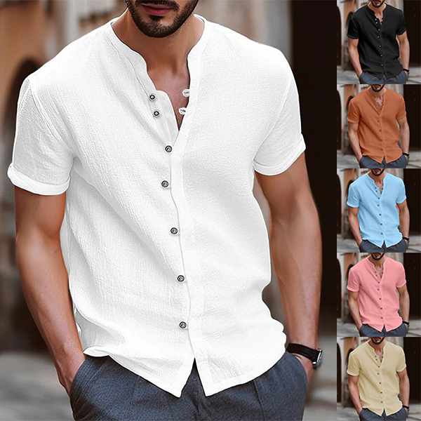 Fashion Solid Color Front Button Short Sleeve Cotton and Linen Shirt for Men