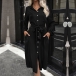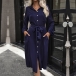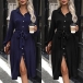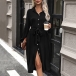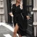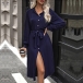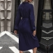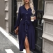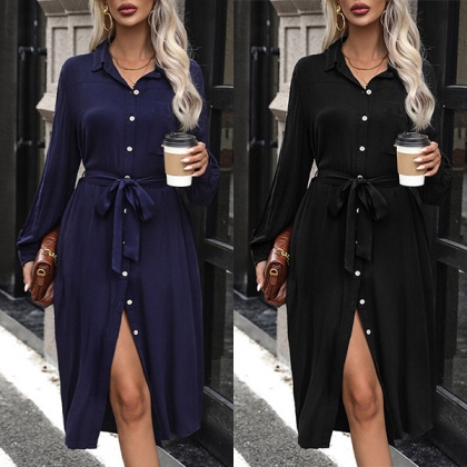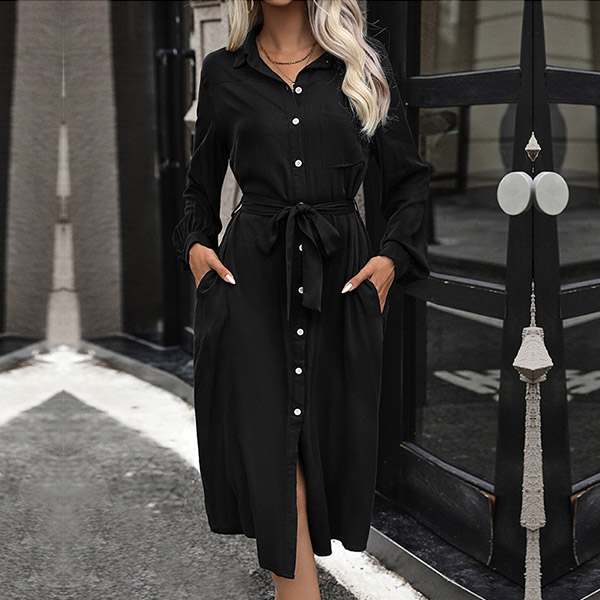 Fashion Solid Color Front Buttoned Stand Collar Long Sleeve Self-tie Waist Shirt Dress