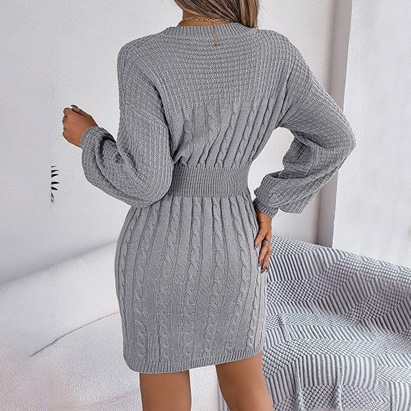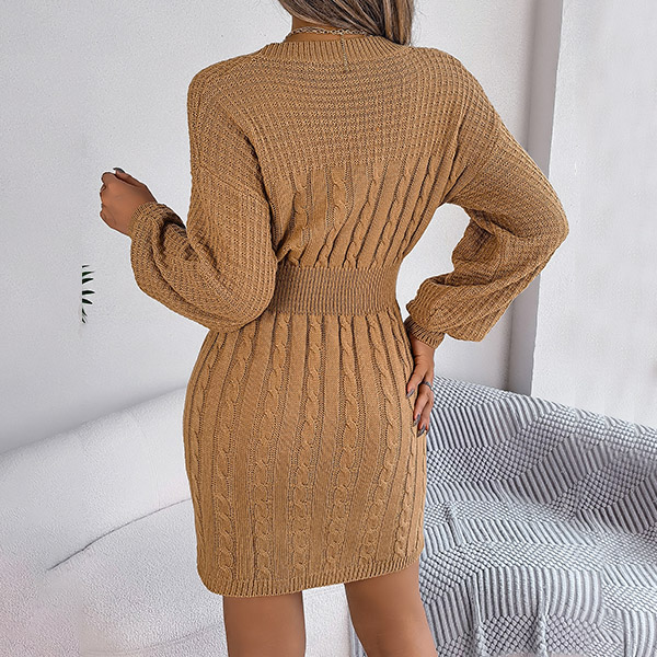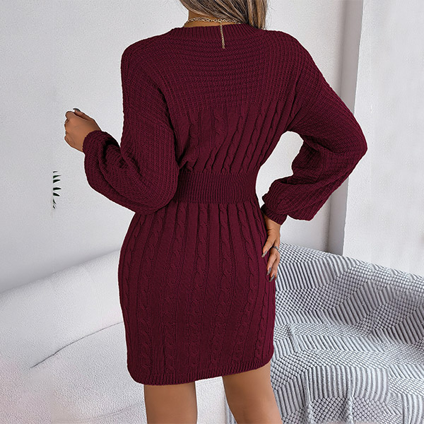 Fashion Solid Color Front Cutout Lantern Sleeve Sweater Dress