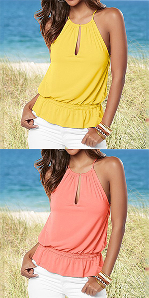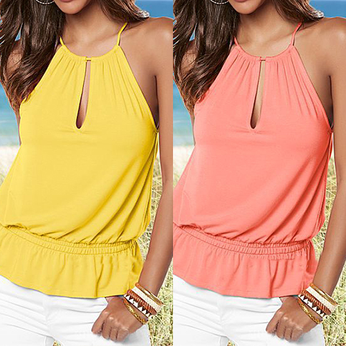 Fashion Solid Color Front Keyhole Sleeveless Elastic Waist T-shirt