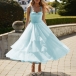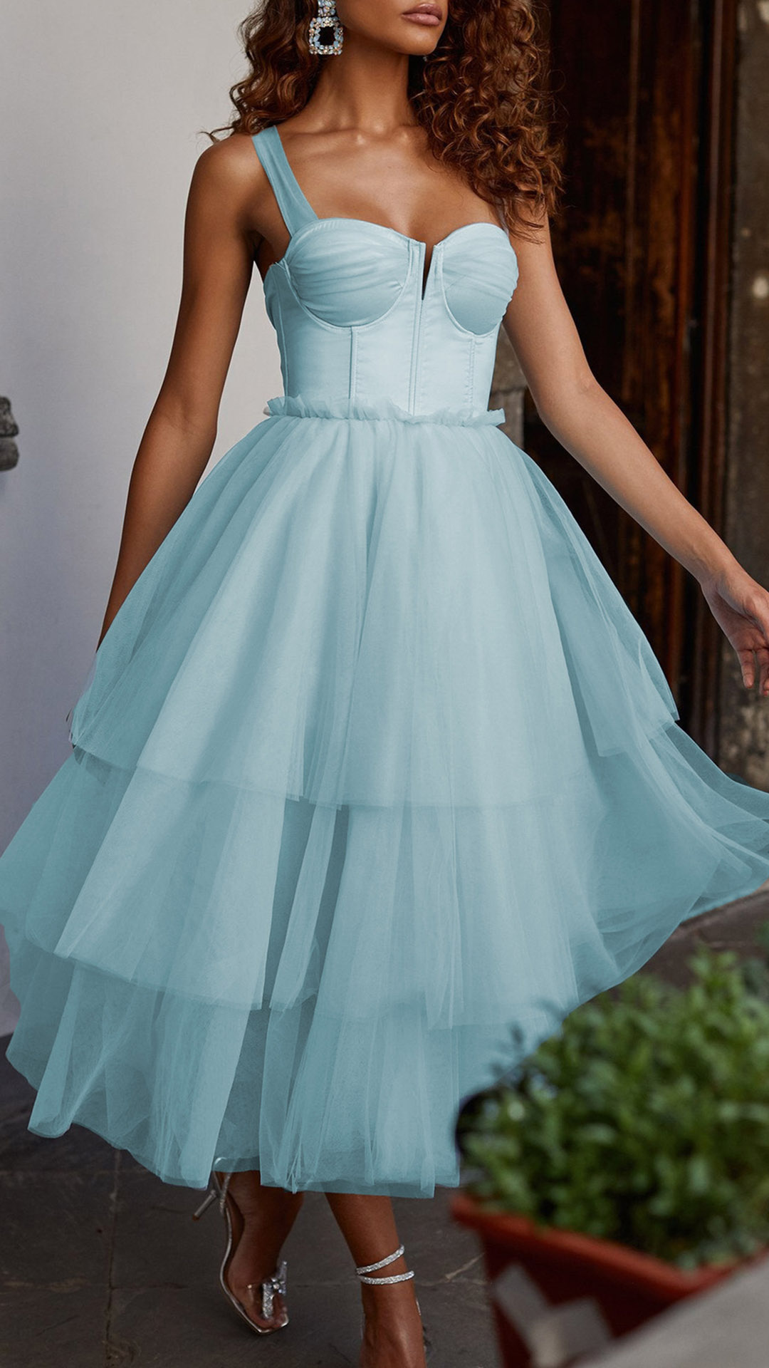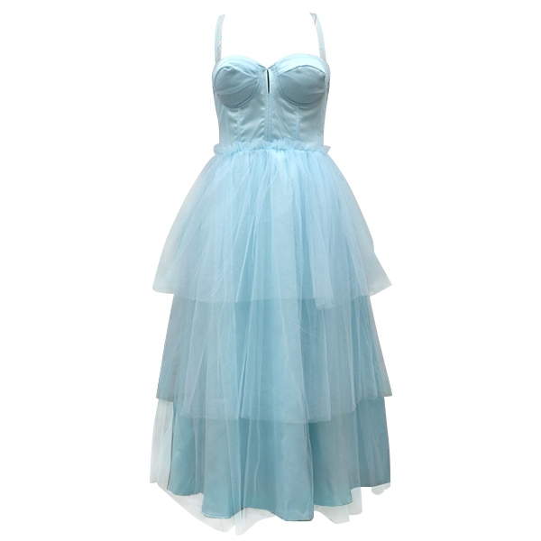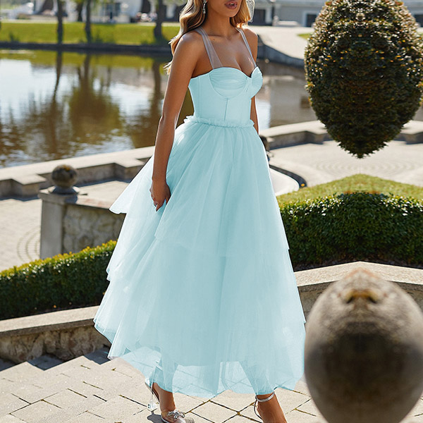 This dress combines elegance and playfulness with its solid color, gauze-spliced details, and tiered design. The lace-up detailing at the back adds a trendy and unique element, allowing you to adjust the fit and add a touch of allure. Pair this dress with heels and statement accessories for a glamorous and party-ready look.