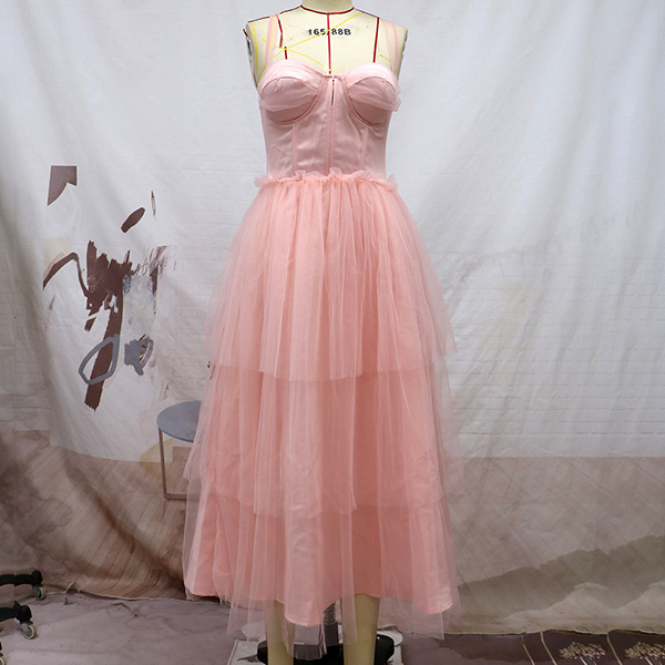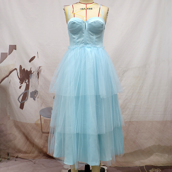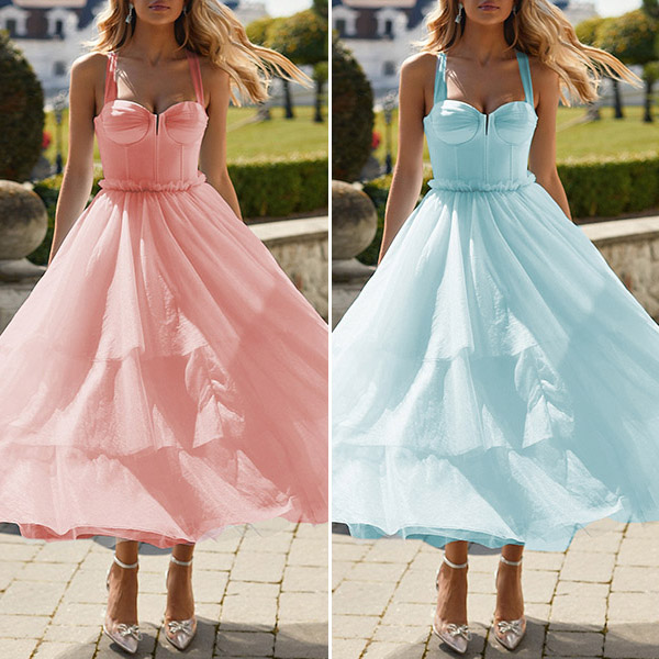 Fashion Solid Color Gauze Spliced Lace-up Tiered Party Dress