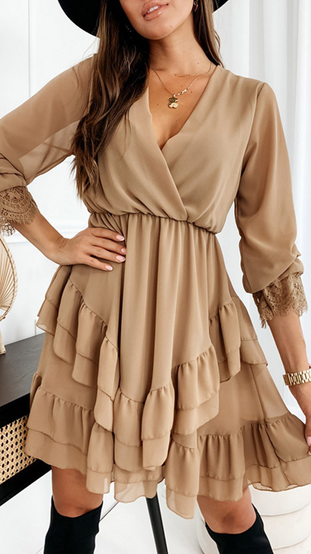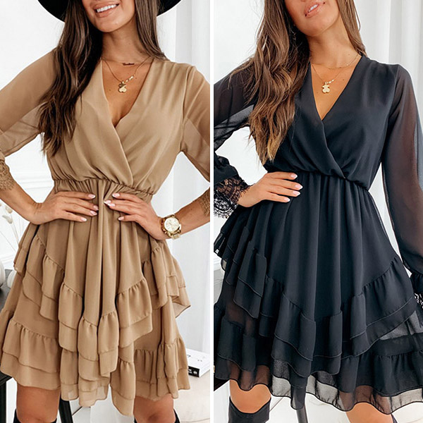 This dress has a gauze spliced long sleeve, sexy v-neck, the skirt design with ruffled tiered layers. Color: Khaki,Black, which one do you like?