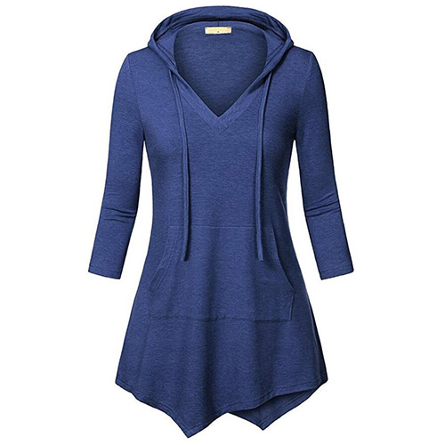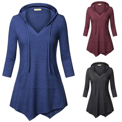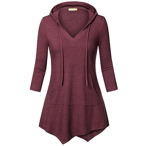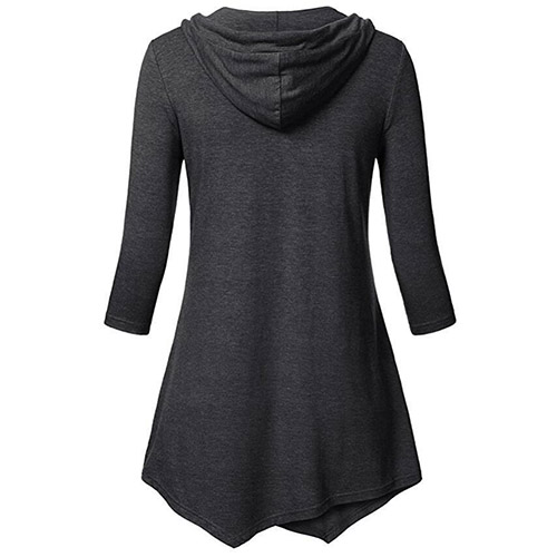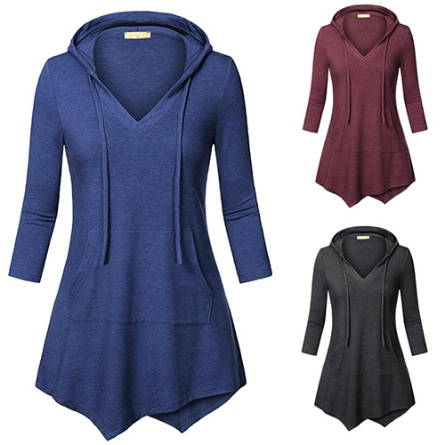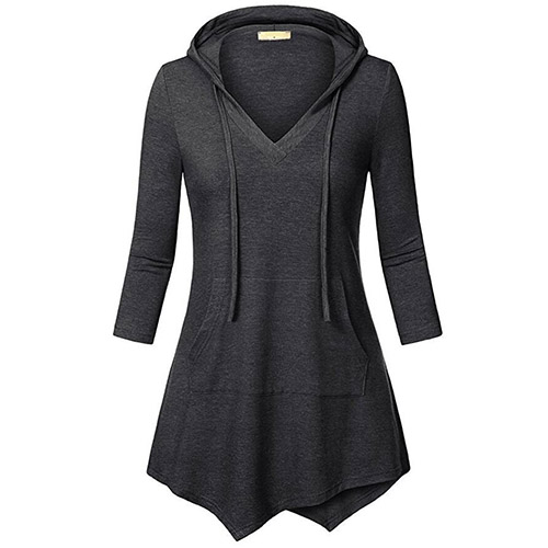 Solid color style,styled with half sleeve,drawstring hood,kangaroo pocket and an irregular hem,this hoodie is sure to keep you cozy yet stylish.