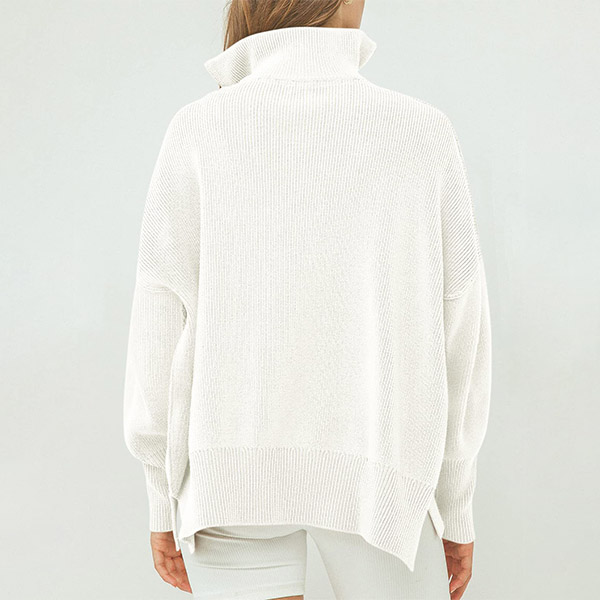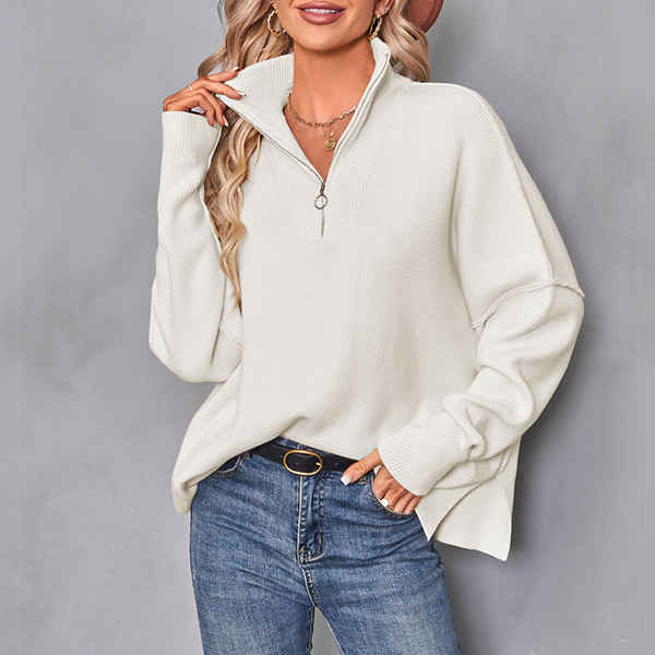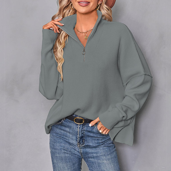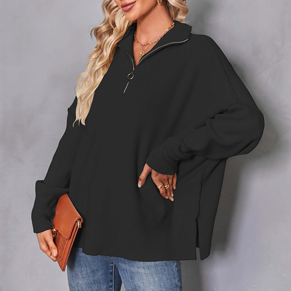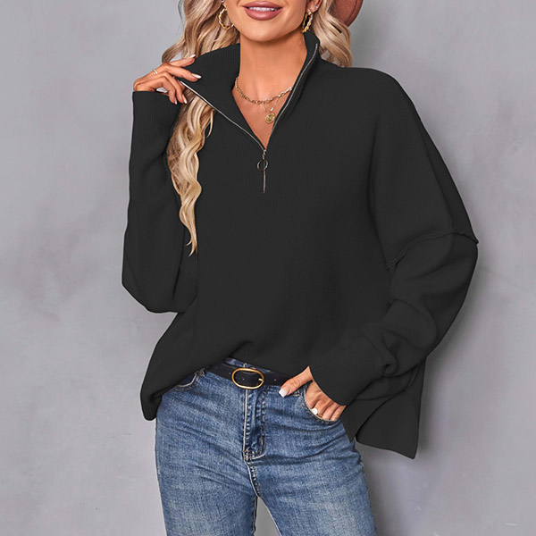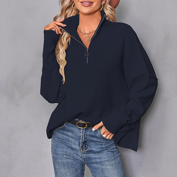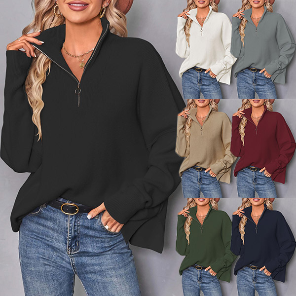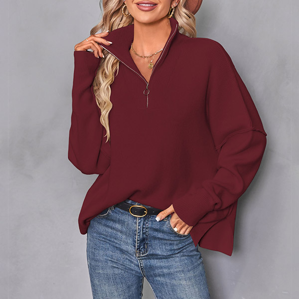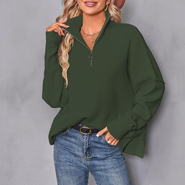 How about this sweater? The half-zipper closure gives you the perfect balance of style and comfort, while the solid color gives you the versatility to pair it with anything. The long sleeves and ribbed cuffs provide warmth and protection from the elements.