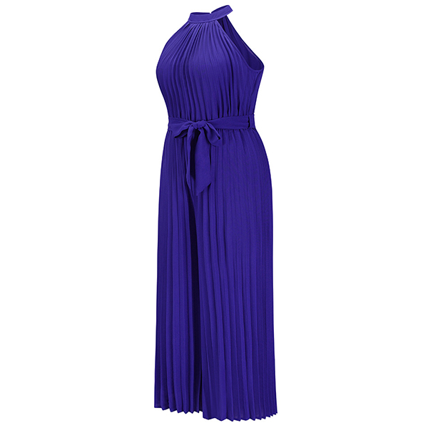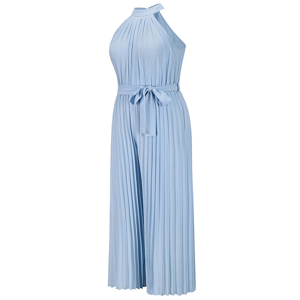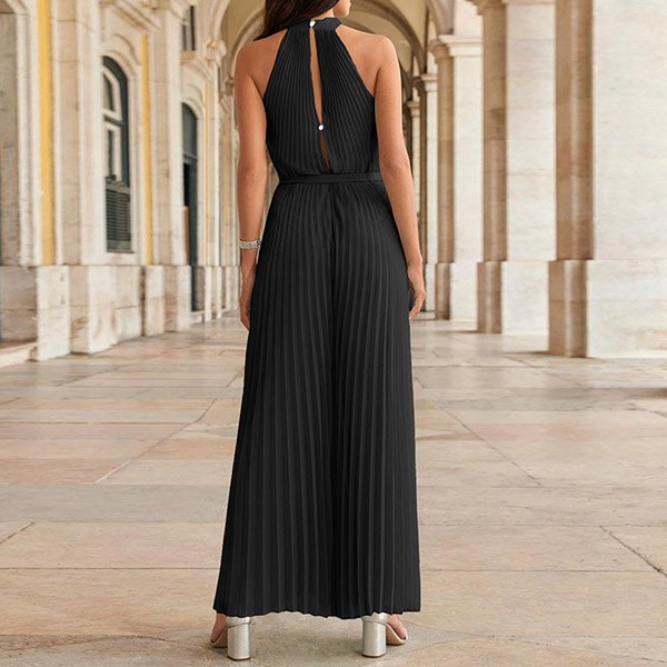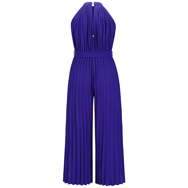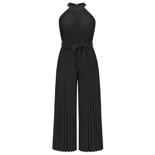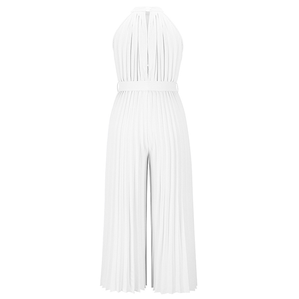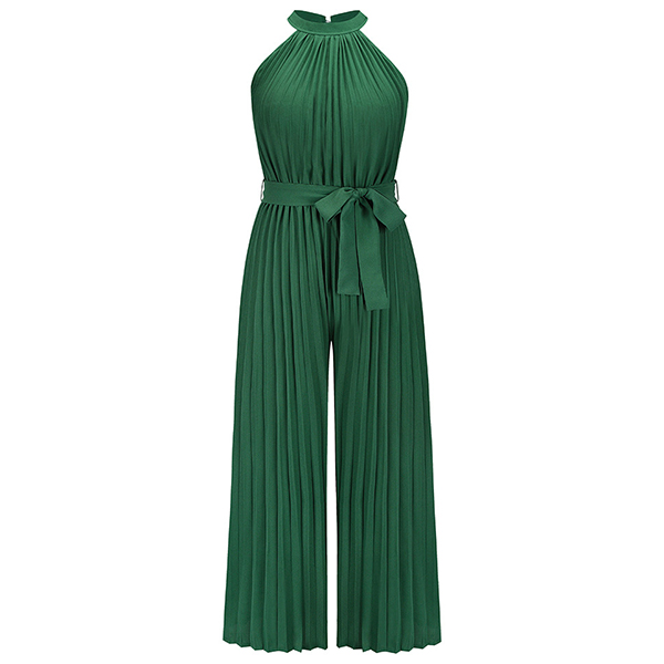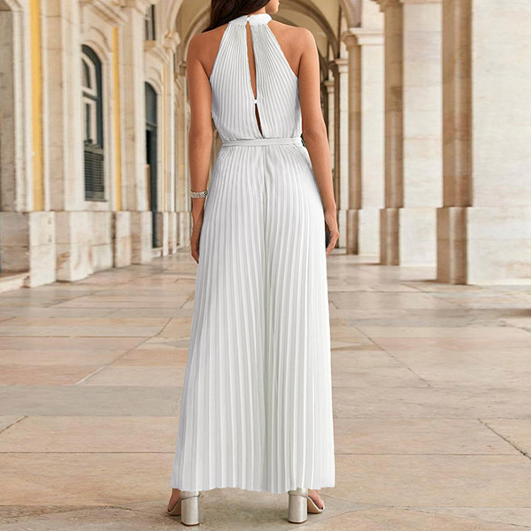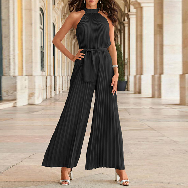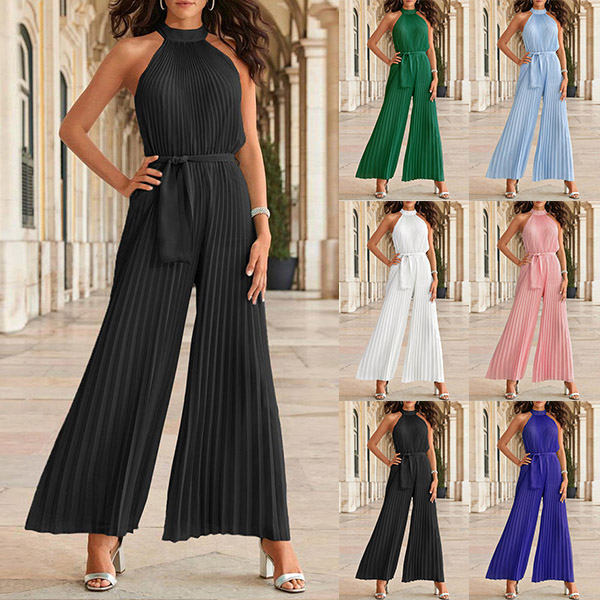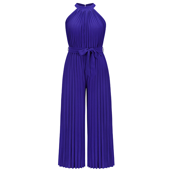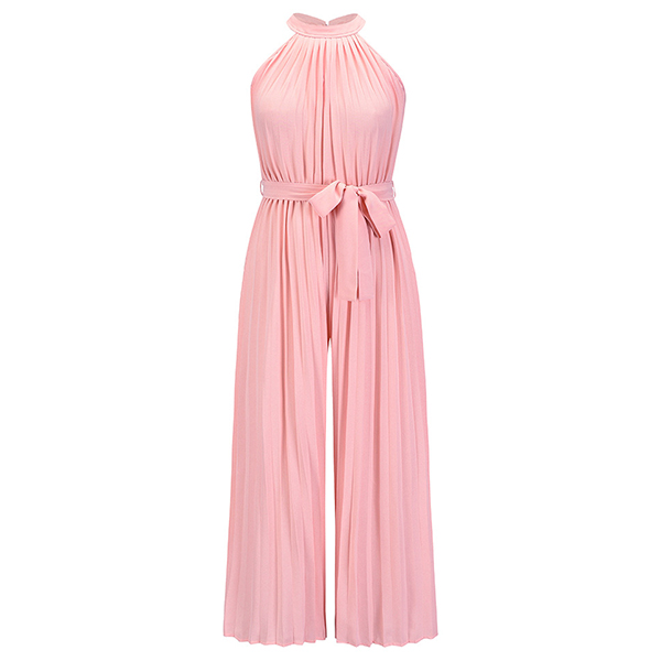 Cette combinaison de couleur unie présente une encolure dos nu avec une ceinture à nouer, un pantalon à jambes larges et un motif plissé. Associez-la à des sandales à lanières et à un chapeau de paille pour un look estival chic.