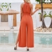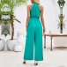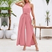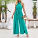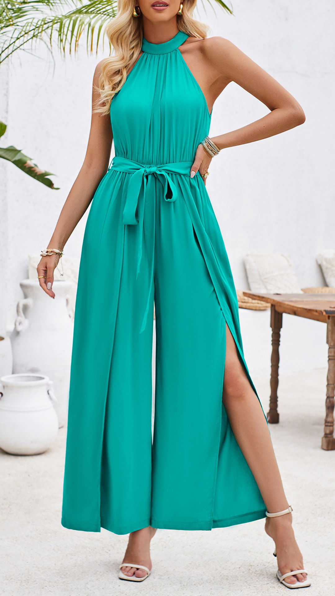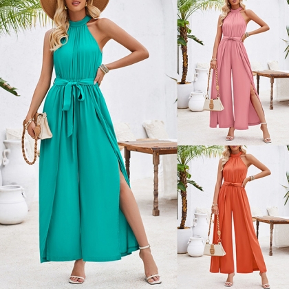 Fashion Solid Color Halterneck Sleeveless Self-tie Slit Wide-leg Jumpsuit