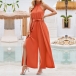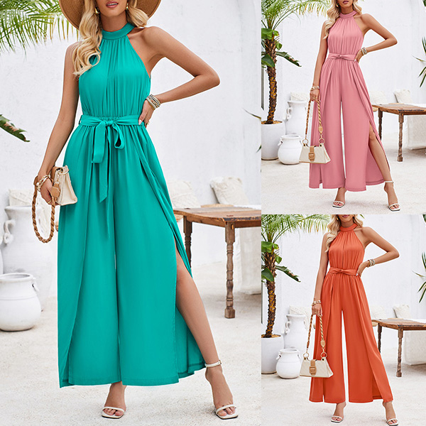 This jumpsuit features a classic round neck ,seelveess design, self-tie detail at the waist, wide-leg pants with a front slit add a fashionable and eye-catching element to the jumpsuit. Whether you're attending a cocktail party, a wedding, or a special event, this jumpsuit is a versatile choice.