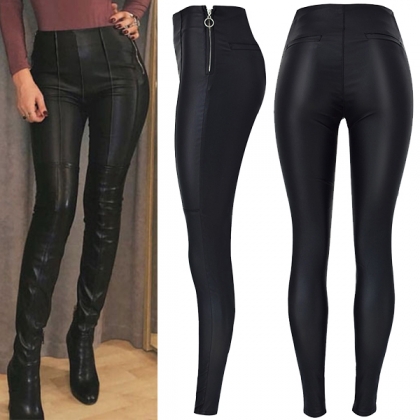 A pair of artificial leather pants featuring a high-rise, solid color,a side zip closure design and slim fit silhouette. Perfect for daily wear!