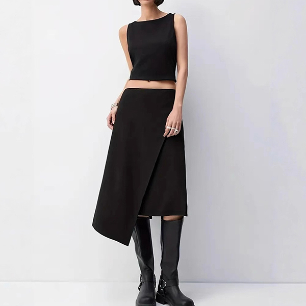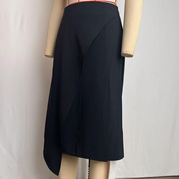 This sophisticated skirt showcases modern minimalism with striking design elements. The high-rise waistline offers contemporary proportions and flattering silhouette enhancement. The irregular hemline brings artistic asymmetry and dynamic movement, ensuring the skirt stands out as a statement piece. The side slit adds functional ease and alluring detail, creating beautiful leg movement while maintaining sophisticated coverage. Together, these elements create intriguing visual flow and contemporary edge. Perfect for elevated casual occasions or modern professional styling.