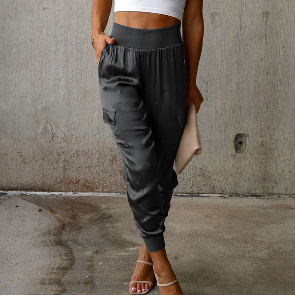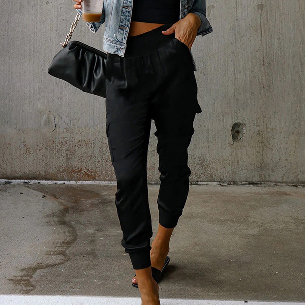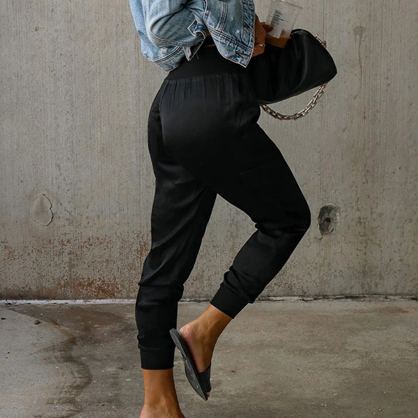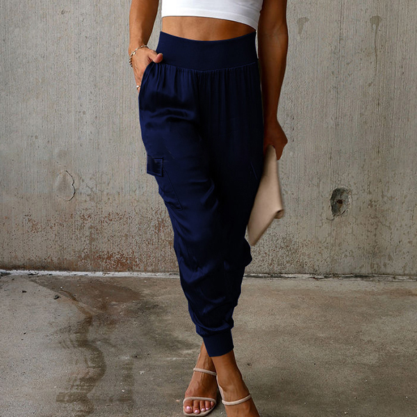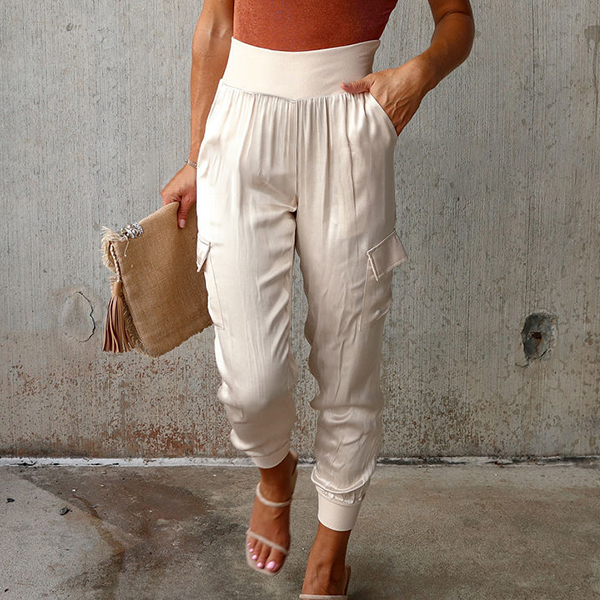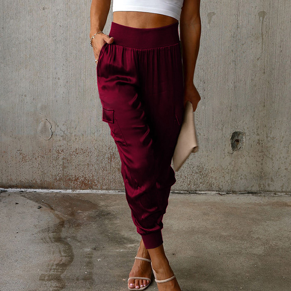 This casual pants features a solid color design, high-rise waist, and side patch pockets for a stylish and functional look.