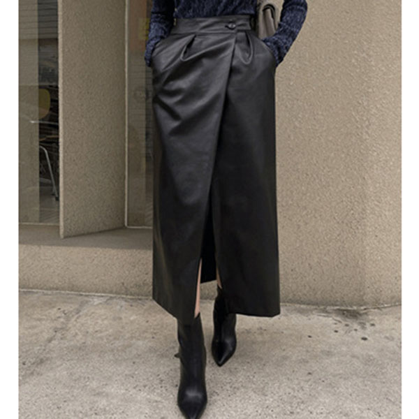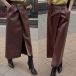 Fashion Solid Color High-rise Side Slit Artificial Leather PU Skirt
